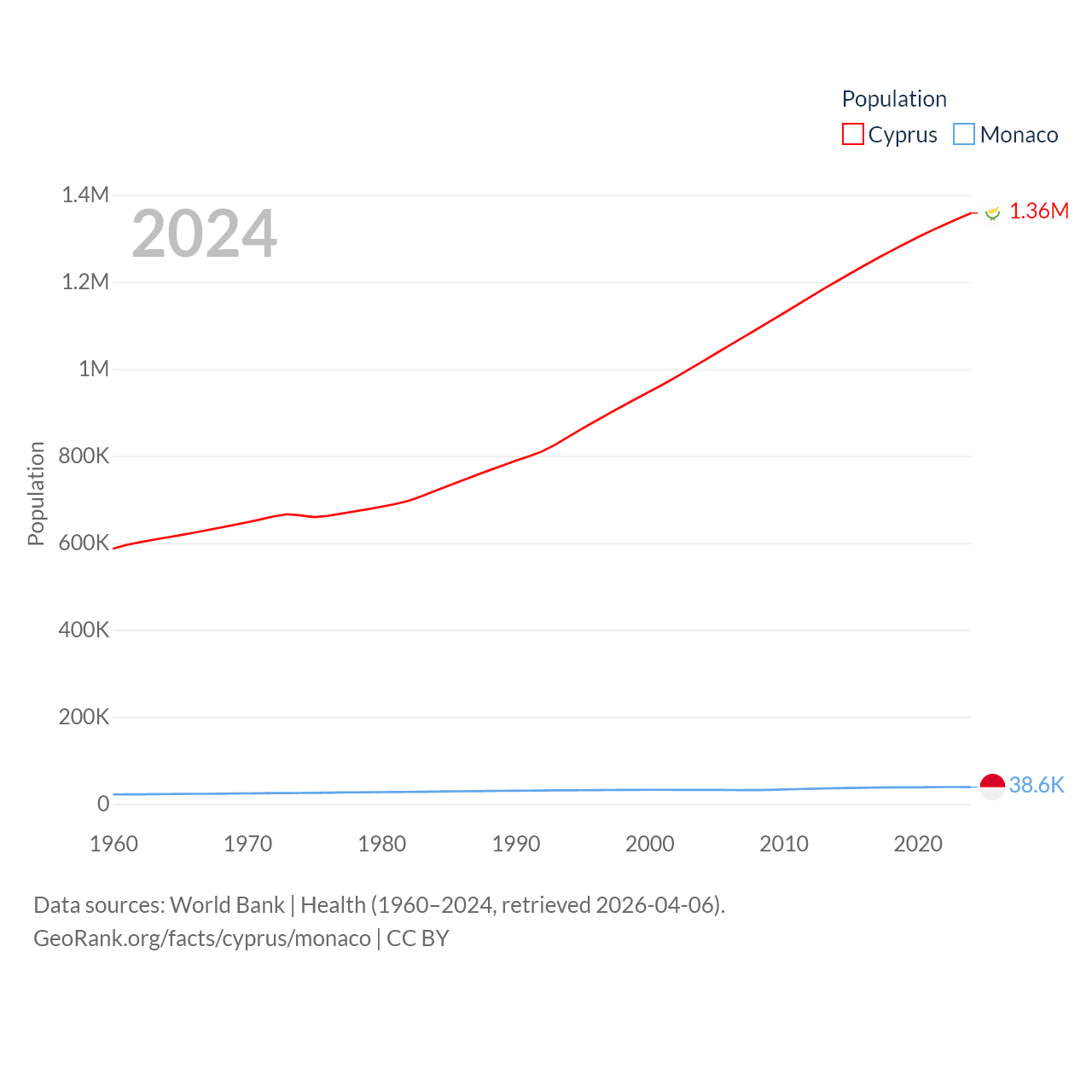 Cyprus has a population of 1.36M (ranked 155/197), compared with 38.6K in Monaco (ranked 191/197). Cyprus' land area is 3,568 sq mi versus 0.8 sq mi for Monaco (ranked 163rd vs. 196th).