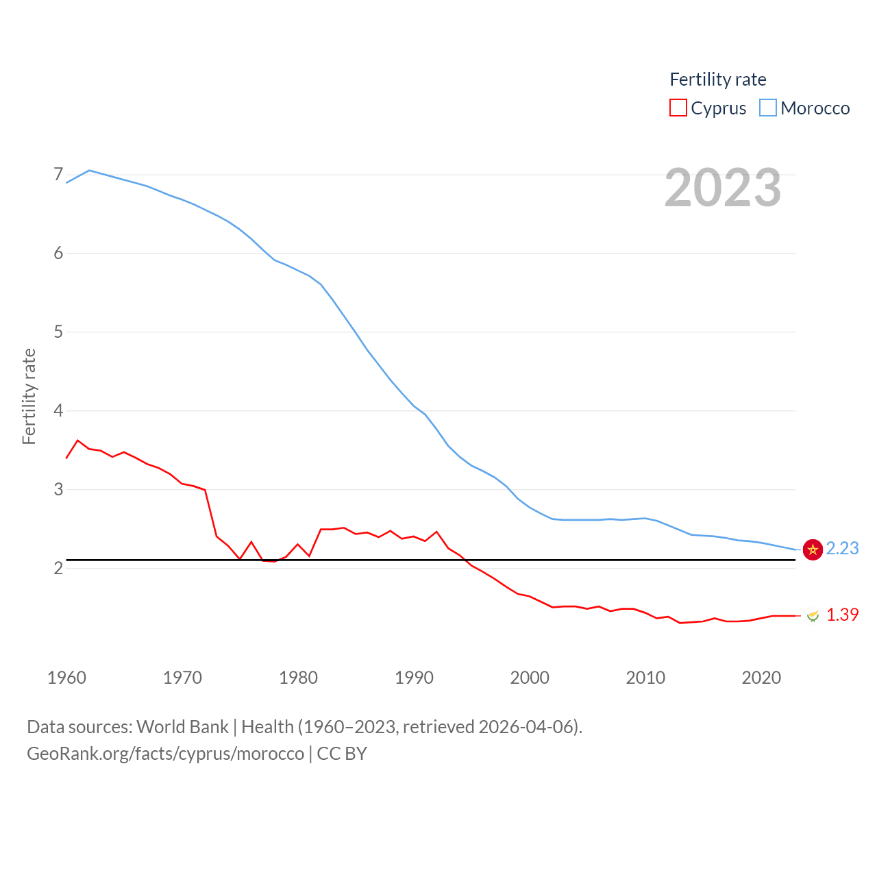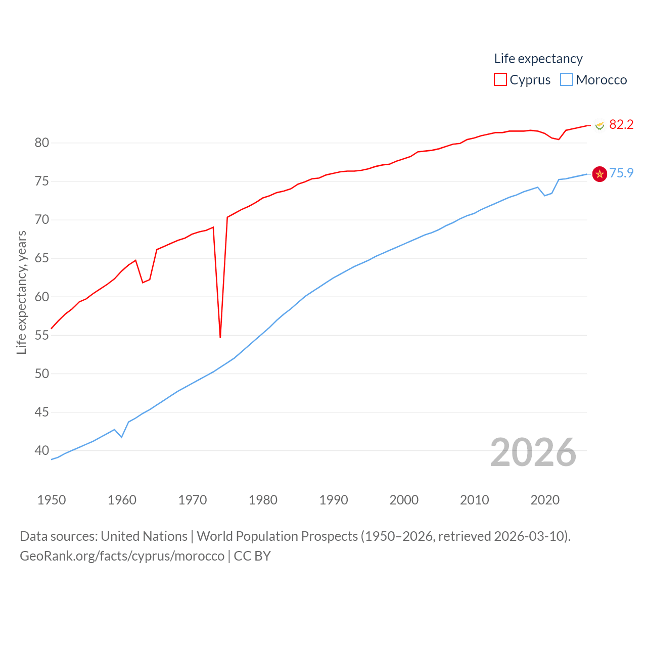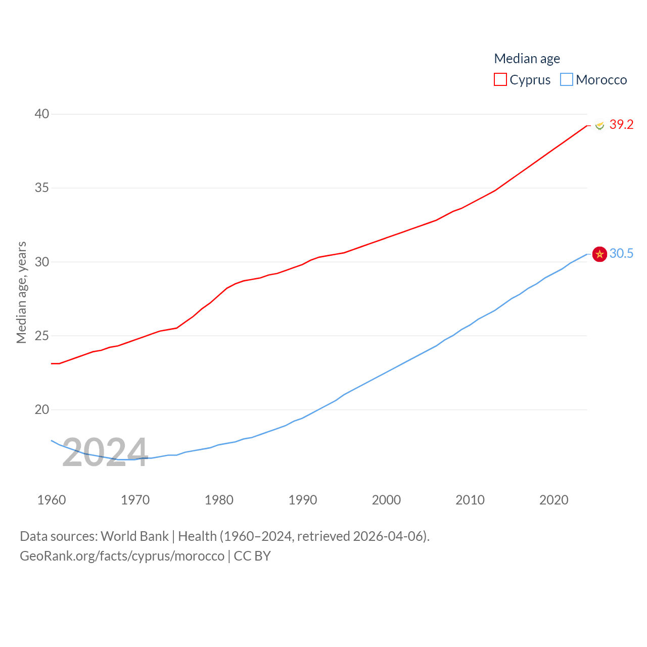 Cyprus has a population of 1.36M (ranked 155/197), compared with 38.1M in Morocco (ranked 39/197). Cyprus' land area is 3,568 sq mi versus 172,317 sq mi for Morocco (ranked 163rd vs. 55th).