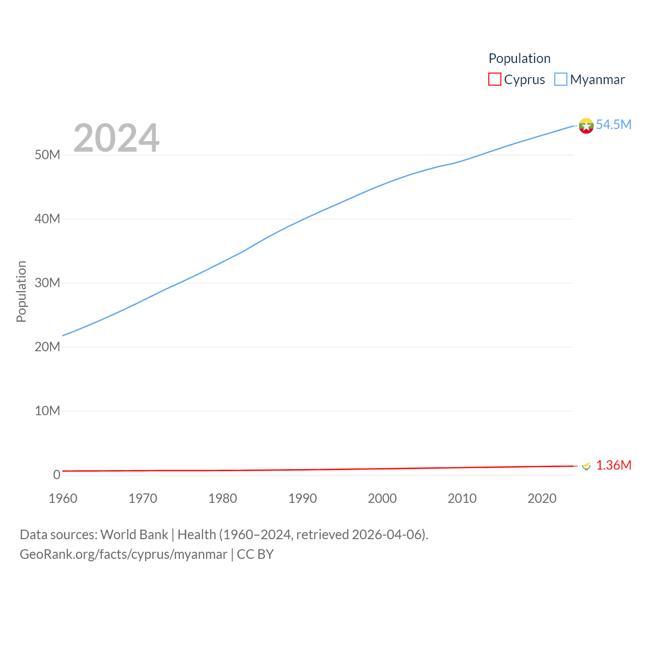 Cyprus has a population of 1.36M (ranked 155/197), compared with 54.5M in Myanmar (ranked 27/197). Cyprus' land area is 3,568 sq mi versus 251,997 sq mi for Myanmar (ranked 163rd vs. 39th).