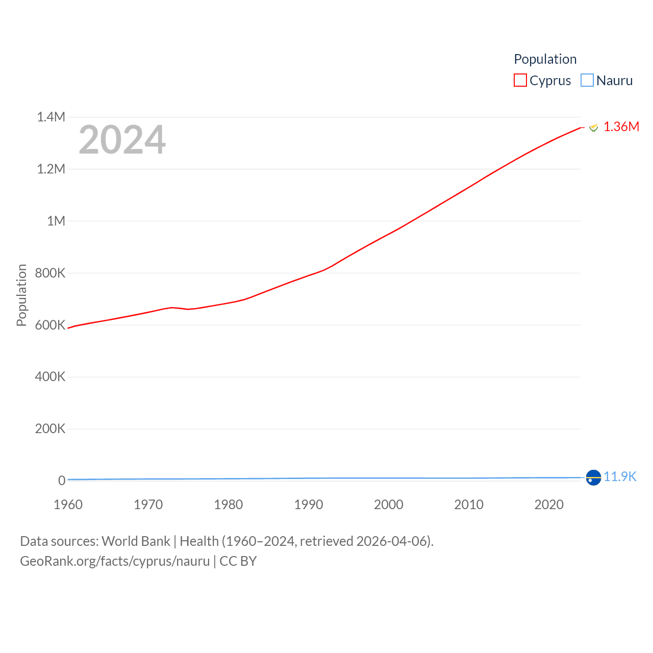 Cyprus has a population of 1.36M (ranked 155/197), compared with 11.9K in Nauru (ranked 195/197). Cyprus' land area is 3,568 sq mi versus 7.72 sq mi for Nauru (ranked 163rd vs. 195th).