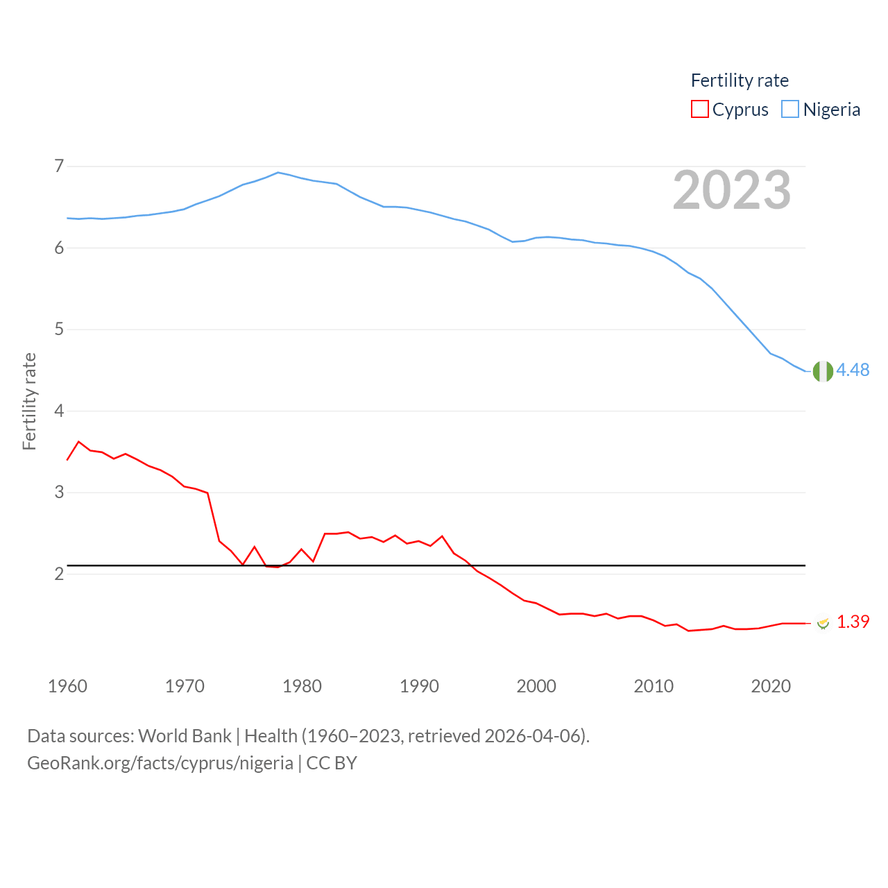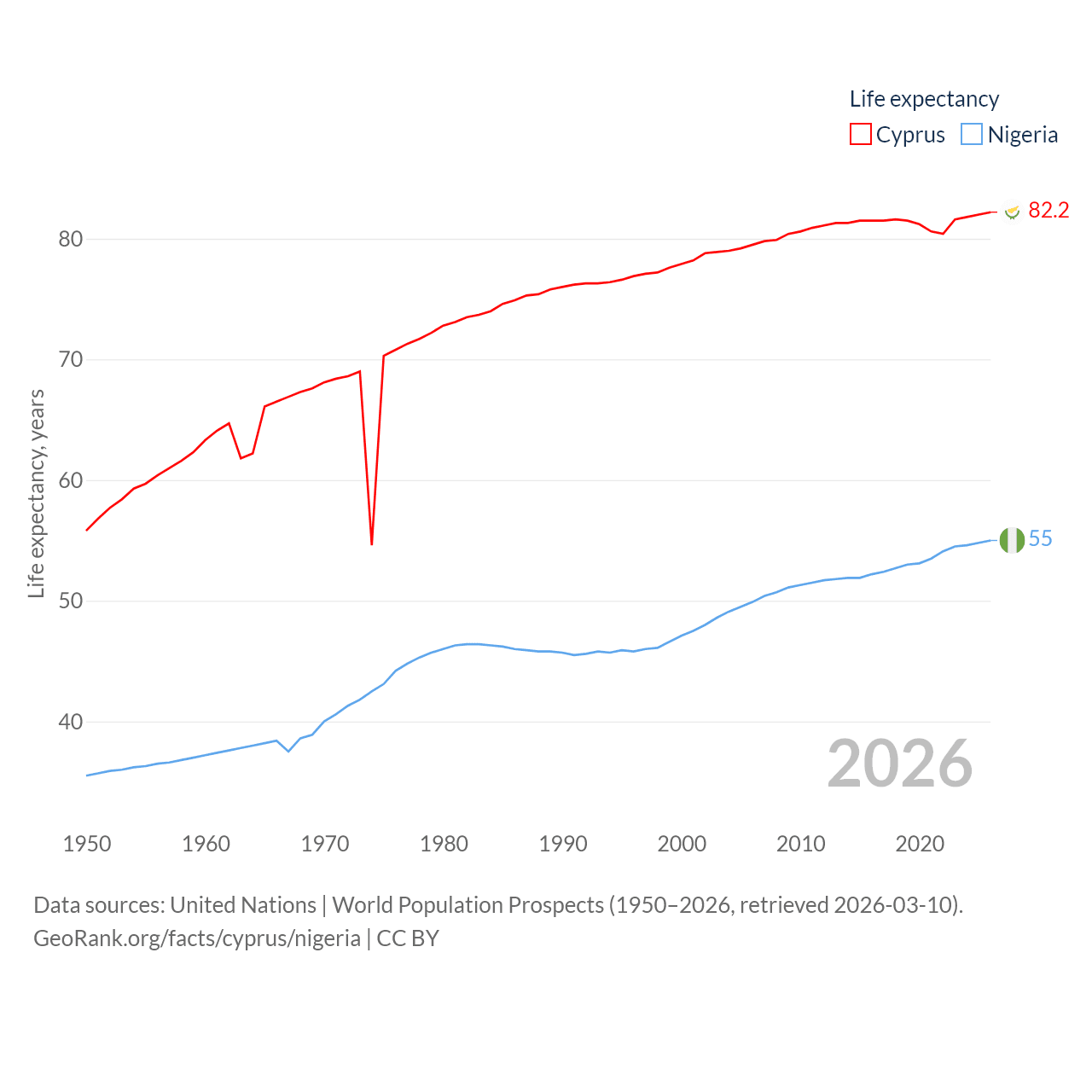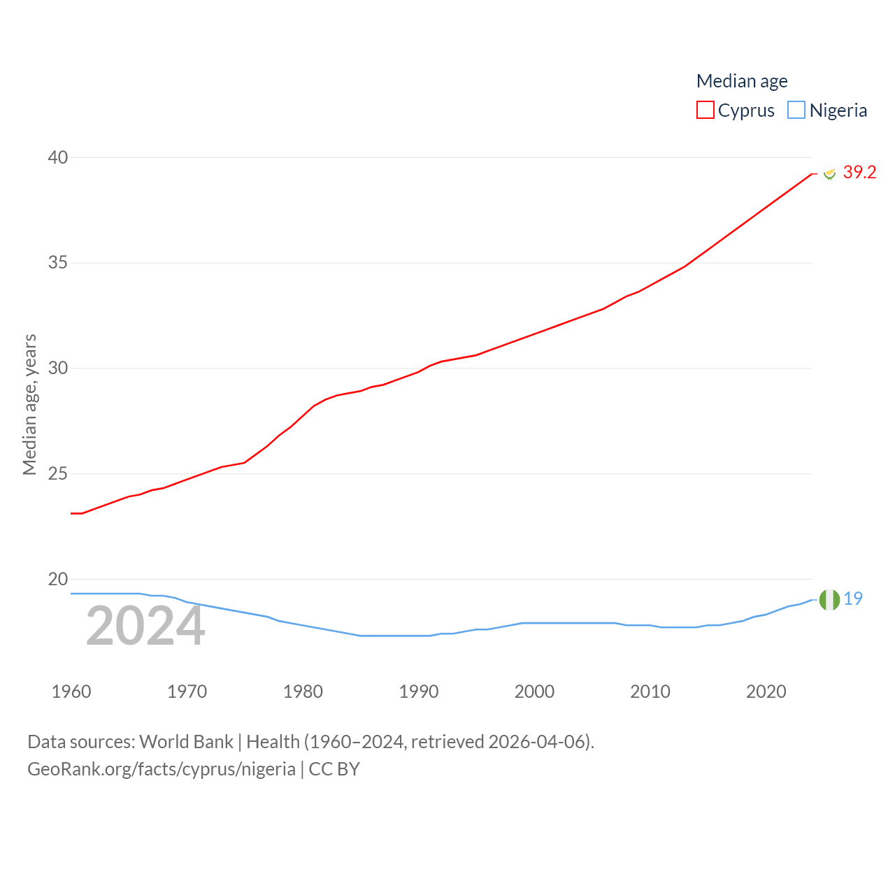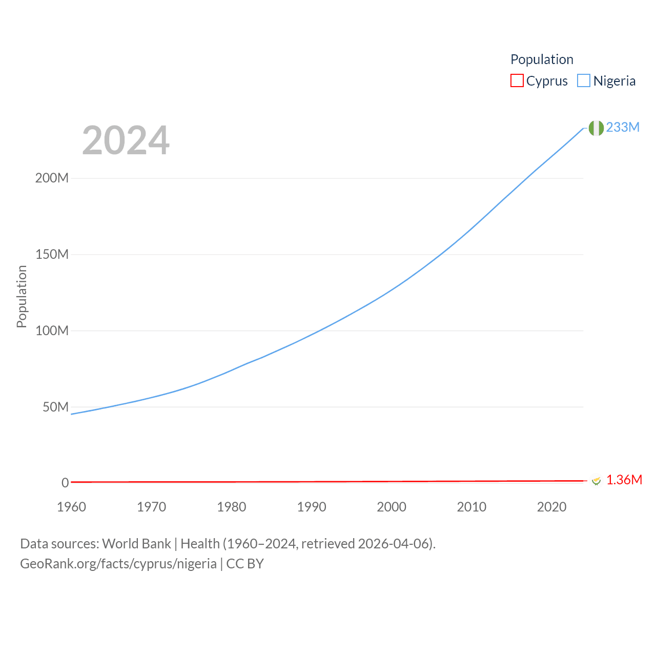 Cyprus has a population of 1.36M (ranked 155/197), compared with 233M in Nigeria (ranked 6/197). Cyprus' land area is 3,568 sq mi versus 351,650 sq mi for Nigeria (ranked 163rd vs. 30th).