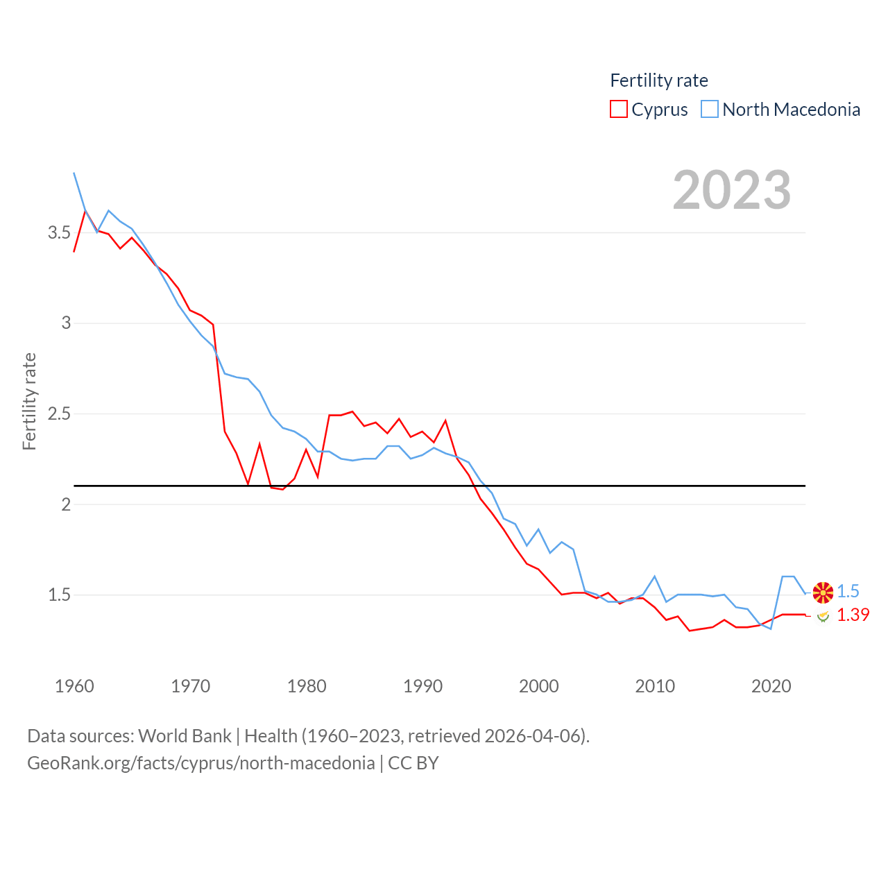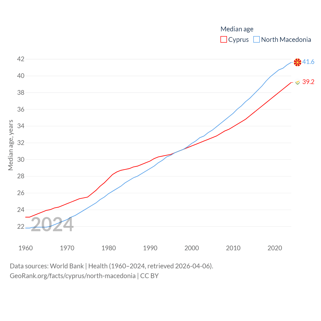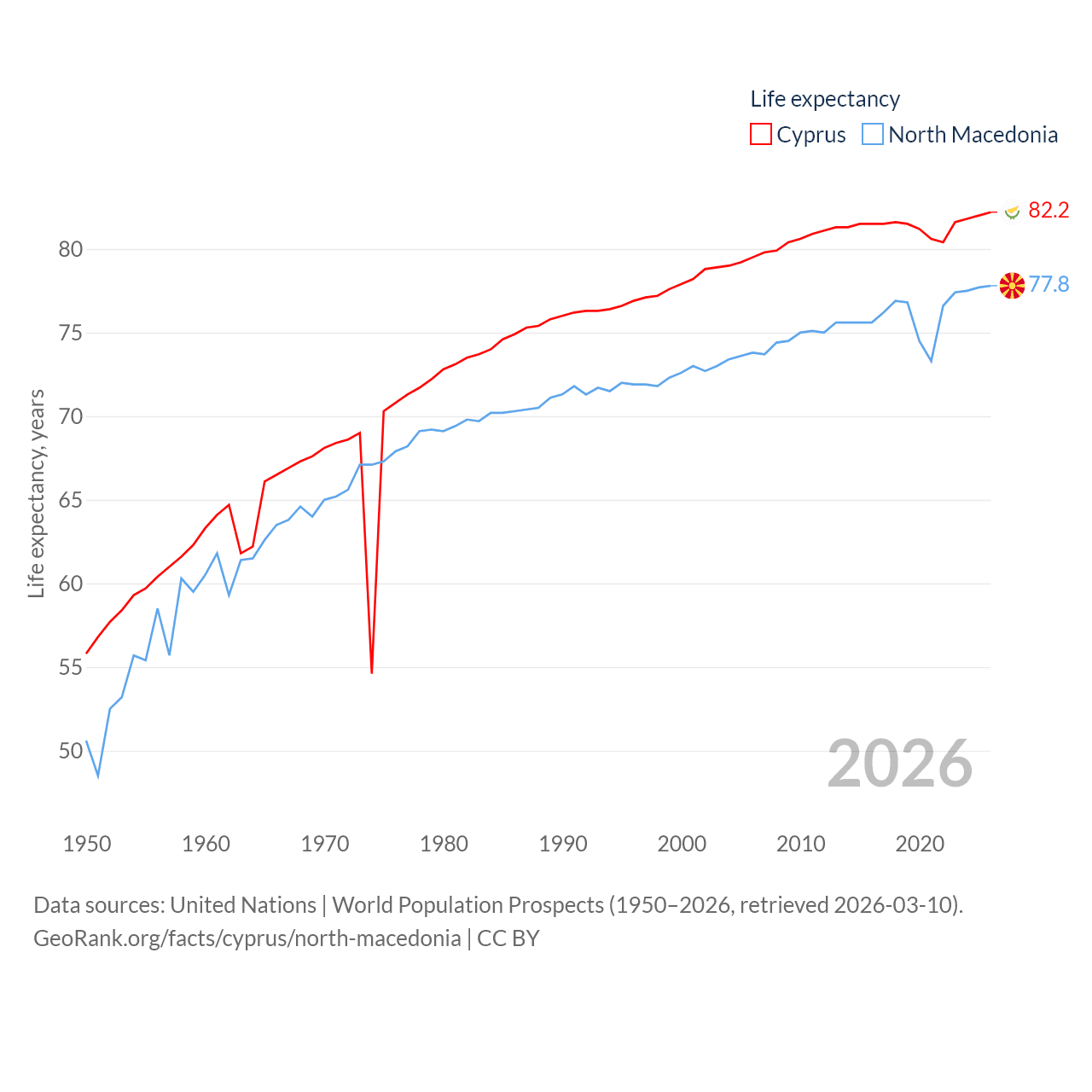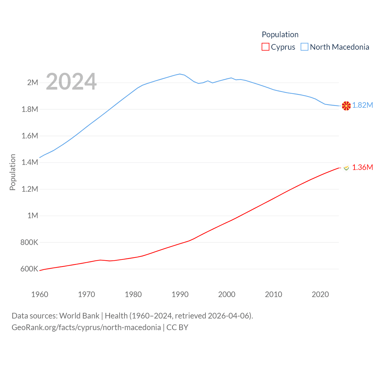 Cyprus has a population of 1.36M (ranked 155/197), compared with 1.82M in North Macedonia (ranked 150/197). Cyprus' land area is 3,568 sq mi versus 9,737 sq mi for North Macedonia (ranked 163rd vs. 145th).