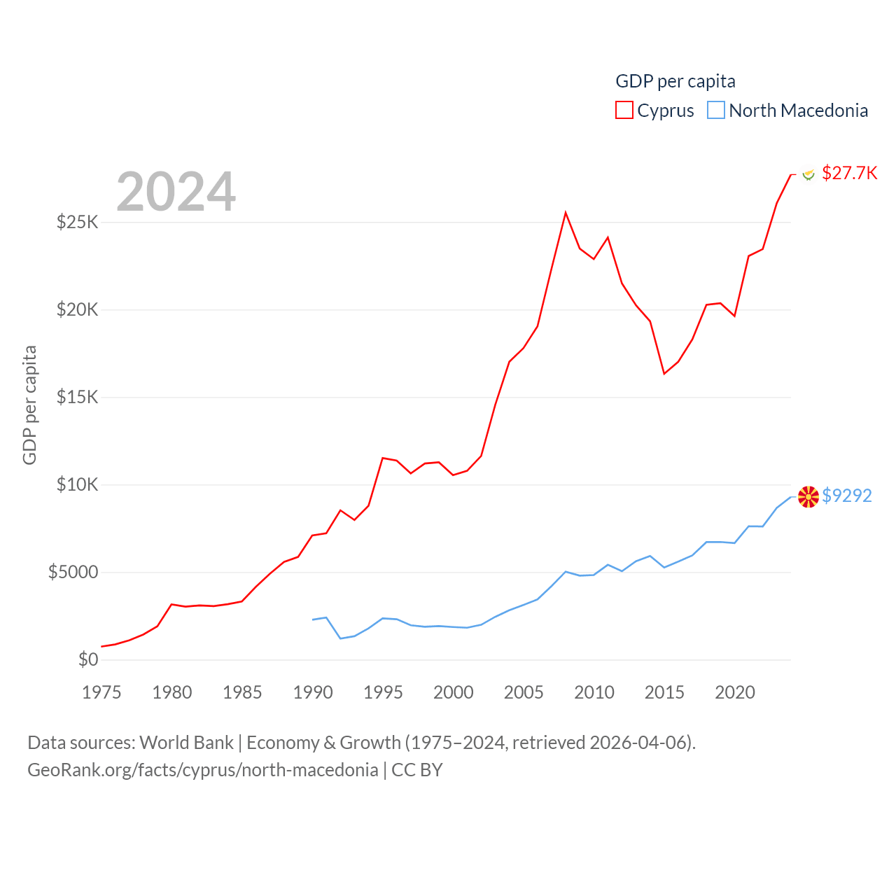 By GDP, Cyprus ranks 103/197 ($37.6B) and North Macedonia ranks 138/197 ($17B). By GDP per capita, Cyprus ranks 45/197 ($27,707), while North Macedonia ranks 88/197 ($9,292).