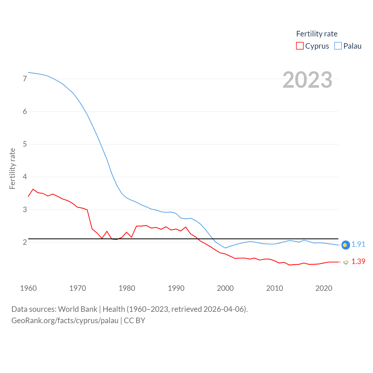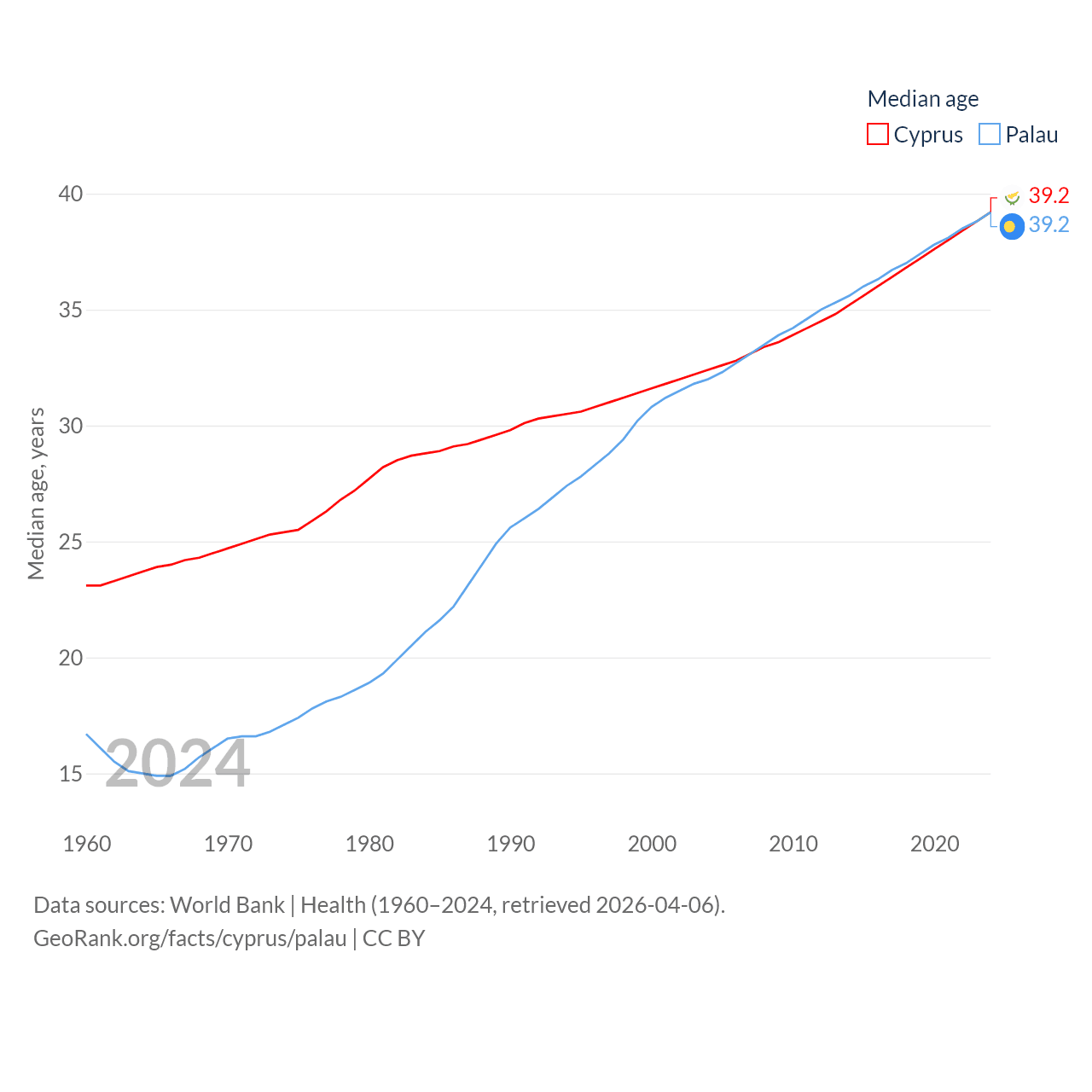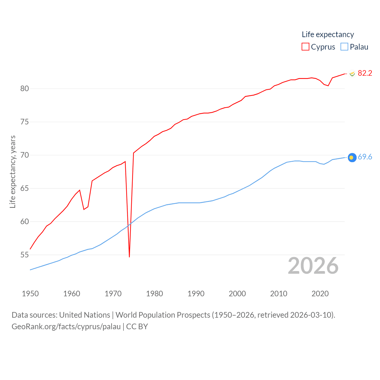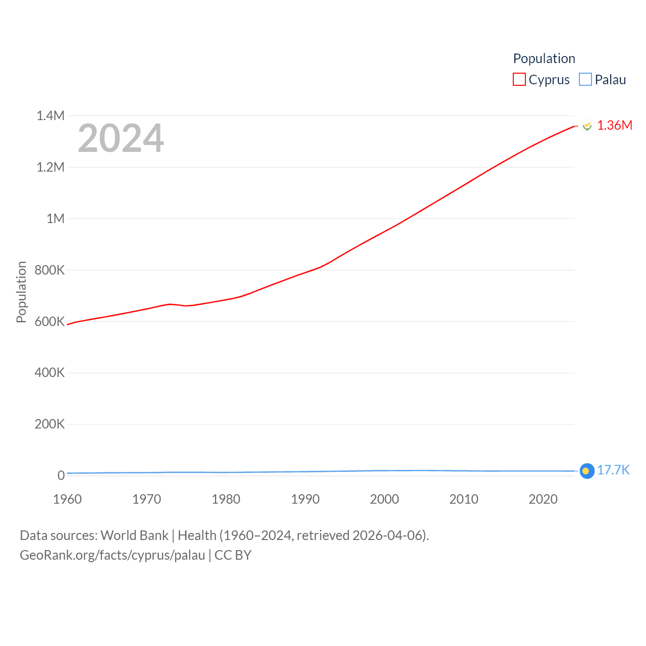 Cyprus has a population of 1.36M (ranked 155/197), compared with 17.7K in Palau (ranked 194/197). Cyprus' land area is 3,568 sq mi versus 177.6 sq mi for Palau (ranked 163rd vs. 180th).