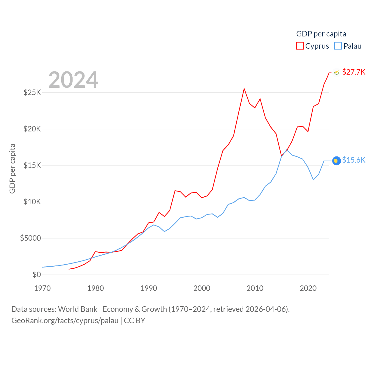By GDP, Cyprus ranks 103/197 ($37.6B) and Palau ranks 194/197 ($277M). By GDP per capita, Cyprus ranks 45/197 ($27,707), while Palau ranks 67/197 ($15,611).