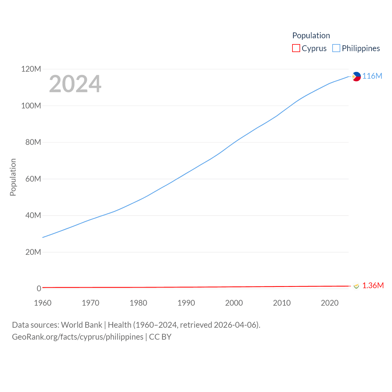 Cyprus has a population of 1.36M (ranked 155/197), compared with 116M in The Philippines (ranked 14/197). Cyprus' land area is 3,568 sq mi versus 115,124 sq mi for The Philippines (ranked 163rd vs. 71st).