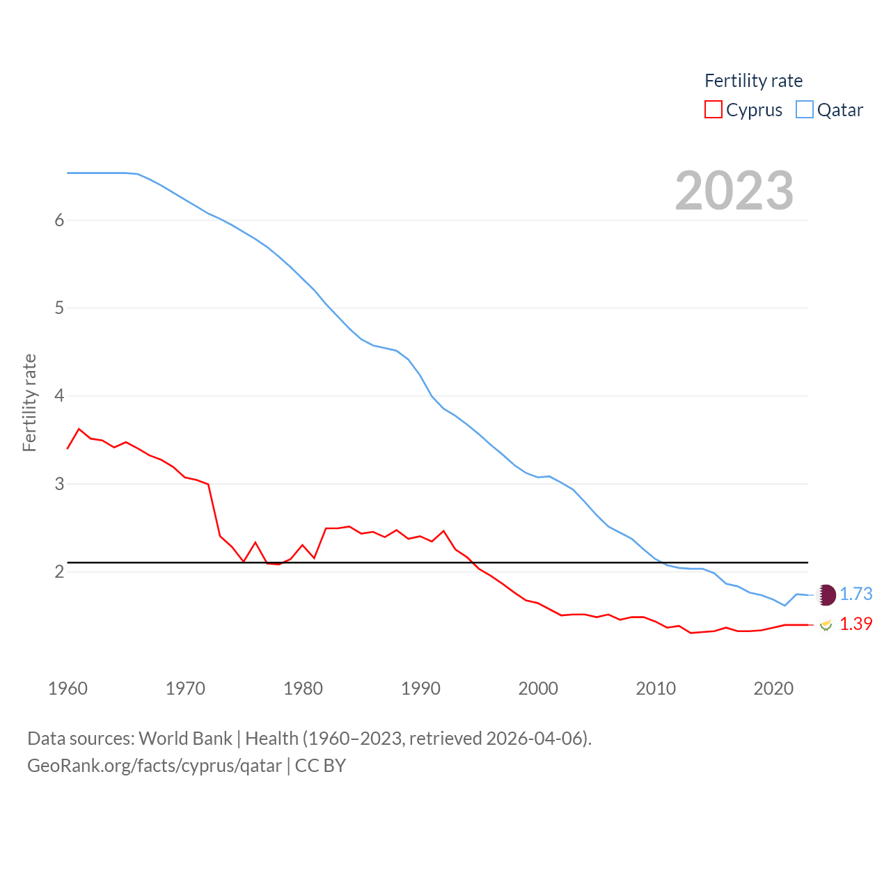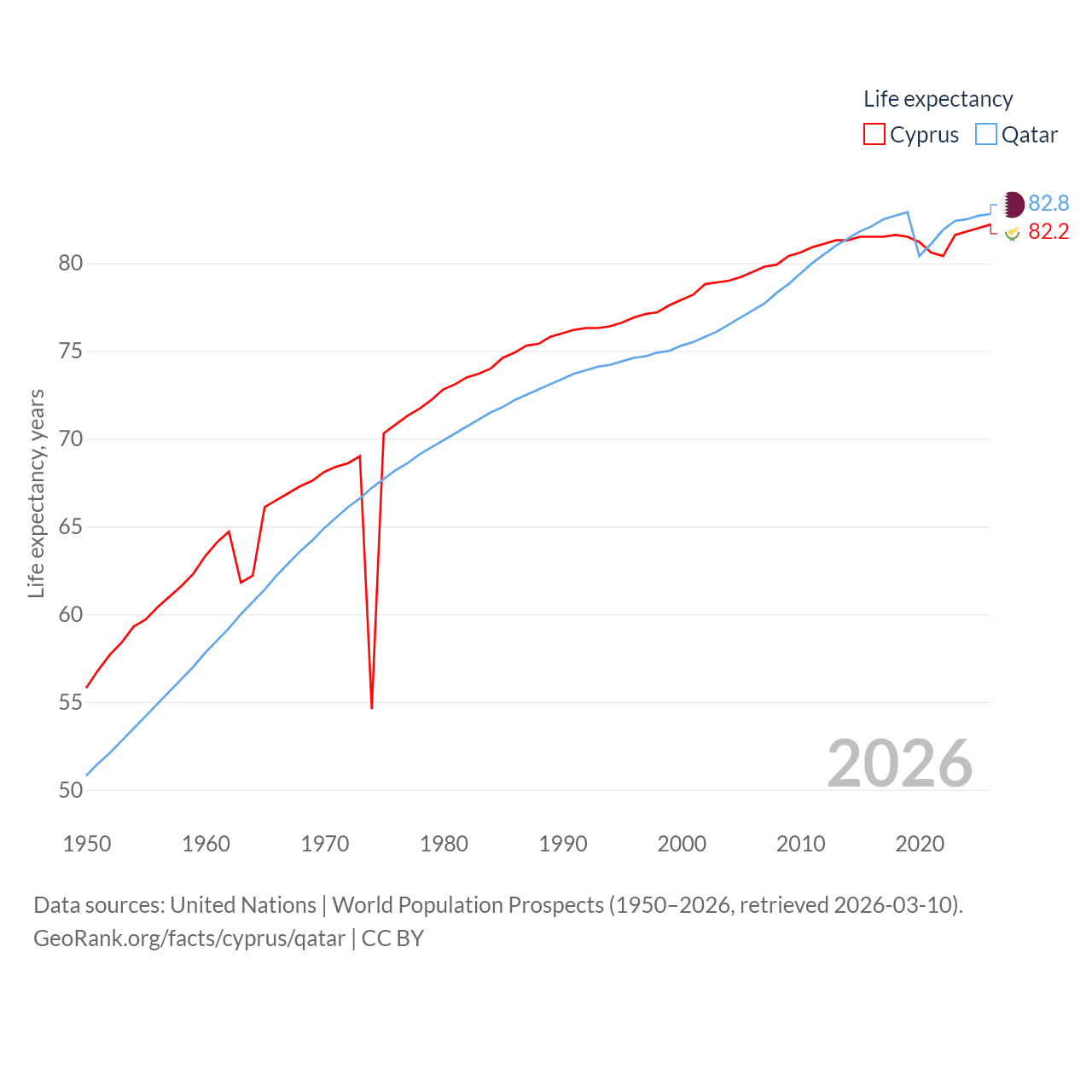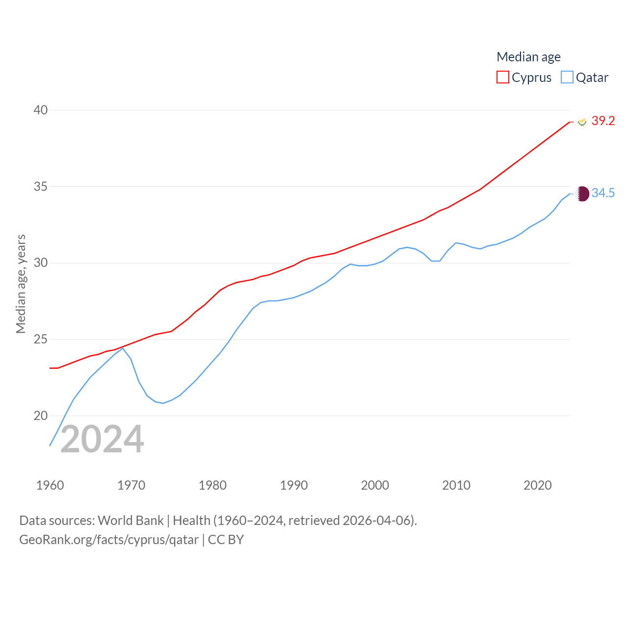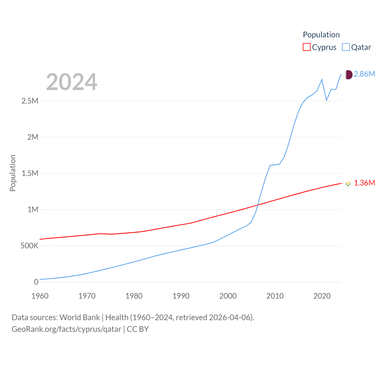 Cyprus has a population of 1.36M (ranked 155/197), compared with 2.86M in Qatar (ranked 138/197). Cyprus' land area is 3,568 sq mi versus 4,436 sq mi for Qatar (ranked 163rd vs. 158th).