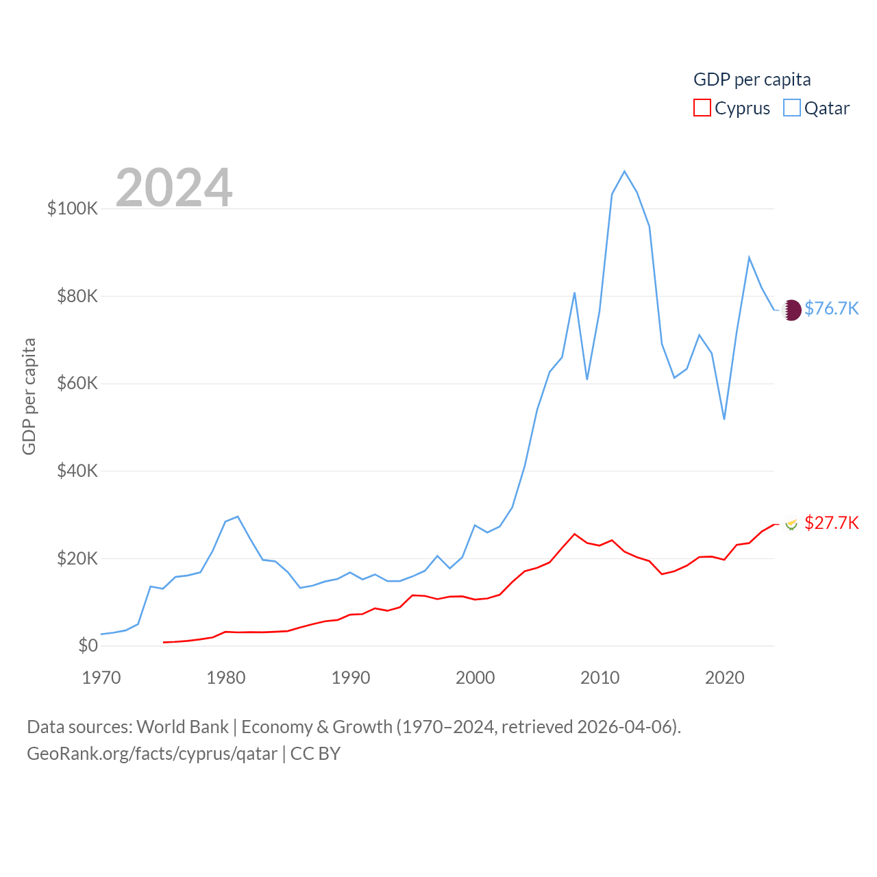 By GDP, Cyprus ranks 103/197 ($37.6B) and Qatar ranks 56/197 ($219B). By GDP per capita, Cyprus ranks 45/197 ($27,707), while Qatar ranks 11/197 ($76,689).