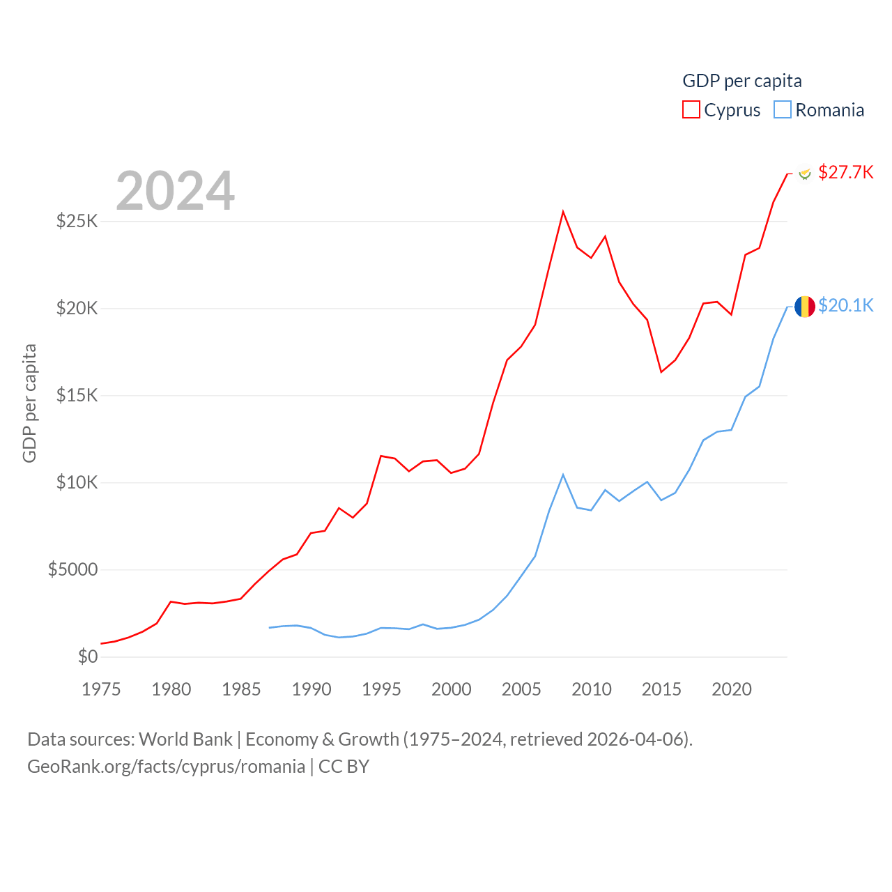 By GDP, Cyprus ranks 103/197 ($37.6B) and Romania ranks 42/197 ($383B). By GDP per capita, Cyprus ranks 45/197 ($27,707), while Romania ranks 58/197 ($20,080).