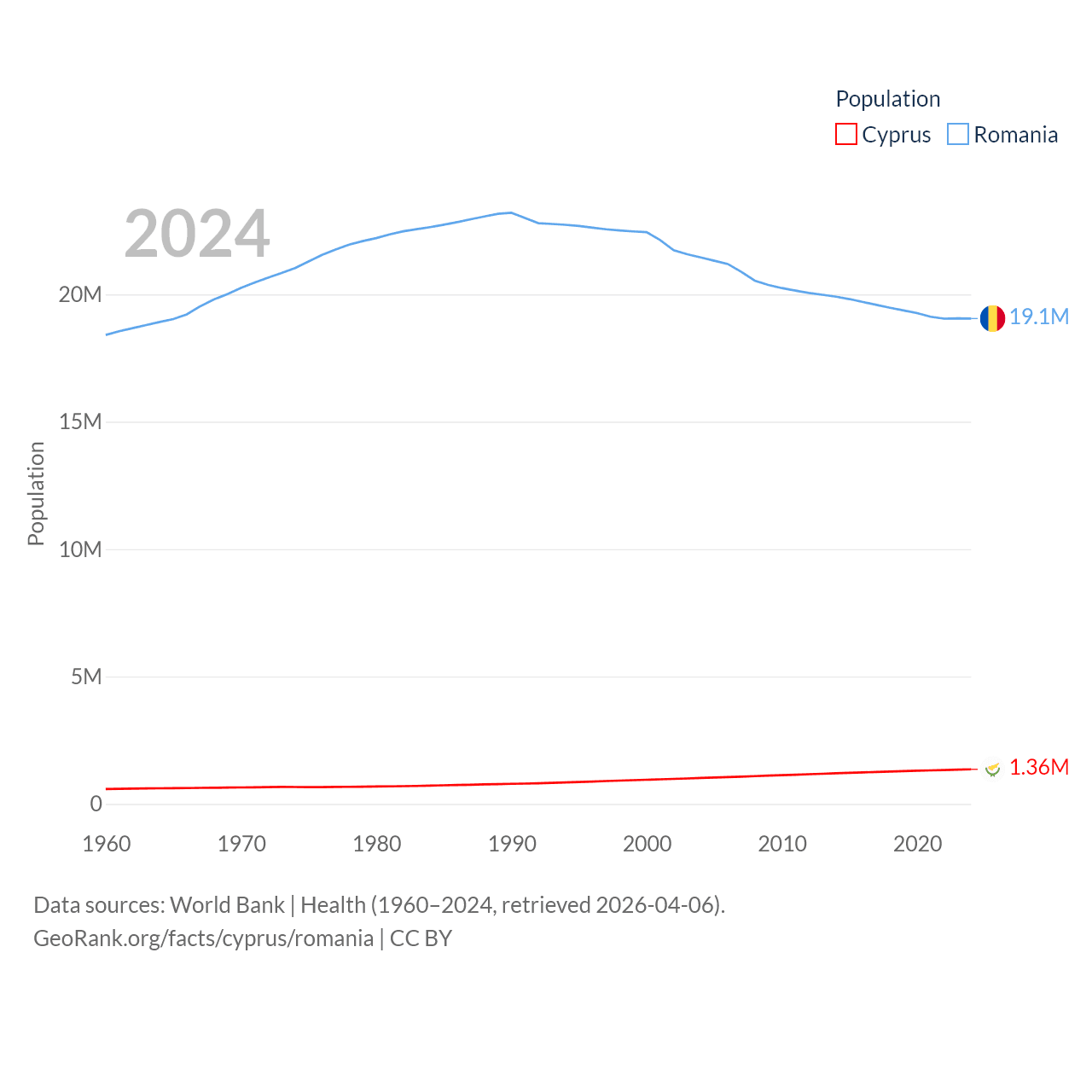 Cyprus has a population of 1.36M (ranked 155/197), compared with 19.1M in Romania (ranked 67/197). Cyprus' land area is 3,568 sq mi versus 88,834 sq mi for Romania (ranked 163rd vs. 80th).
