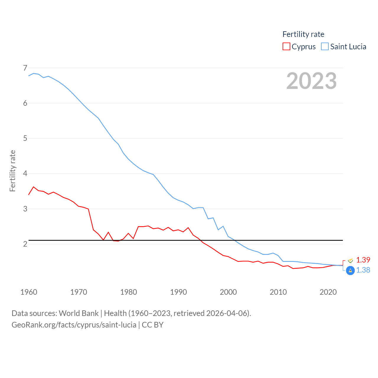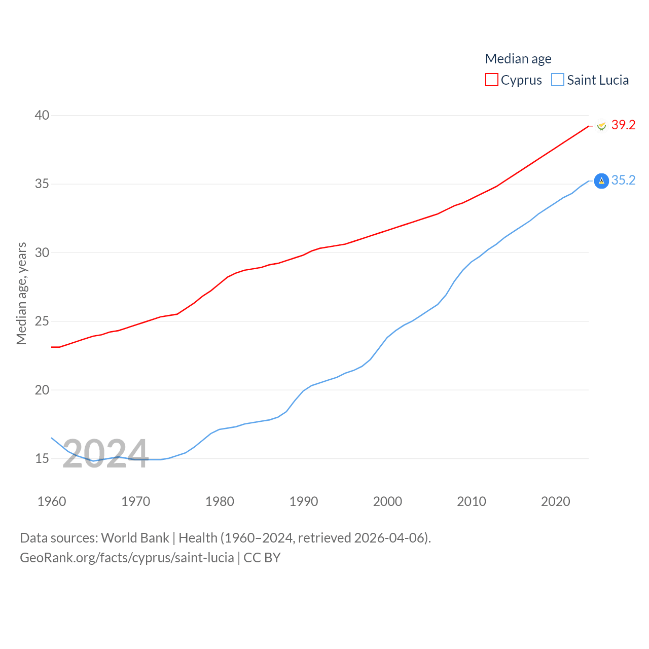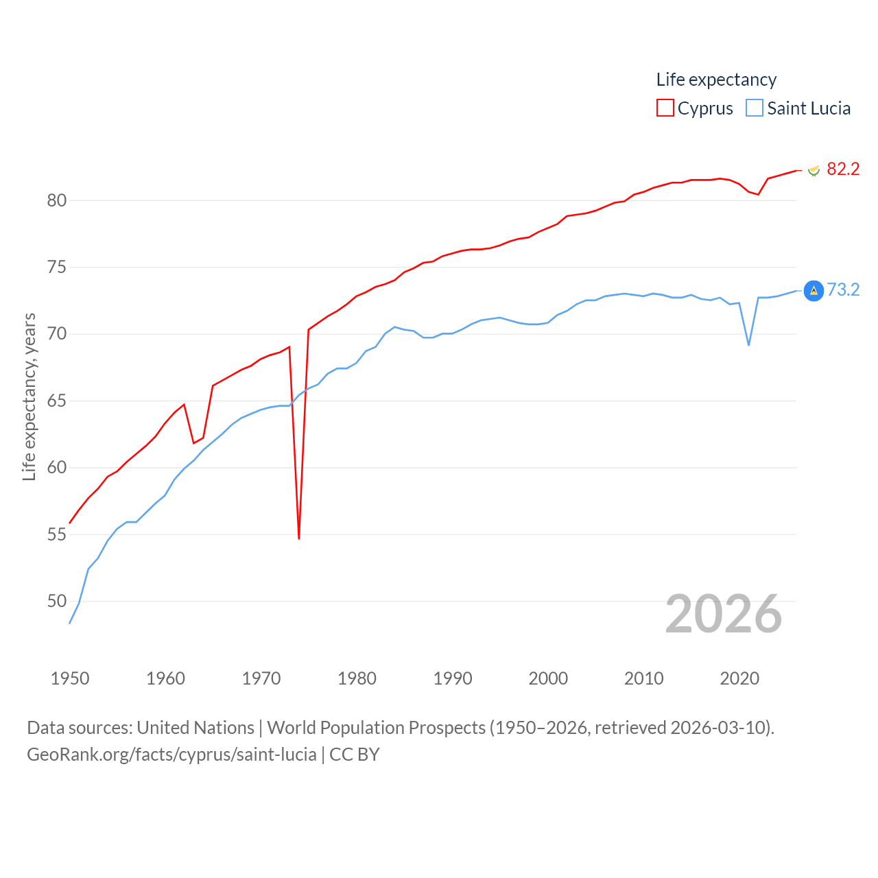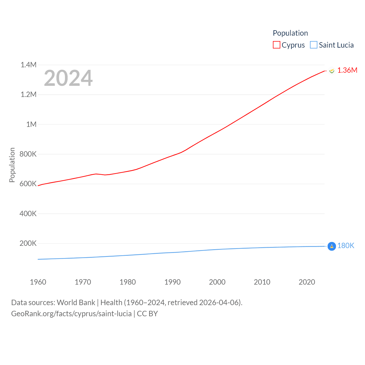 Cyprus has a population of 1.36M (ranked 155/197), compared with 180K in Saint Lucia (ranked 178/197). Cyprus' land area is 3,568 sq mi versus 235.5 sq mi for Saint Lucia (ranked 163rd vs. 178th).