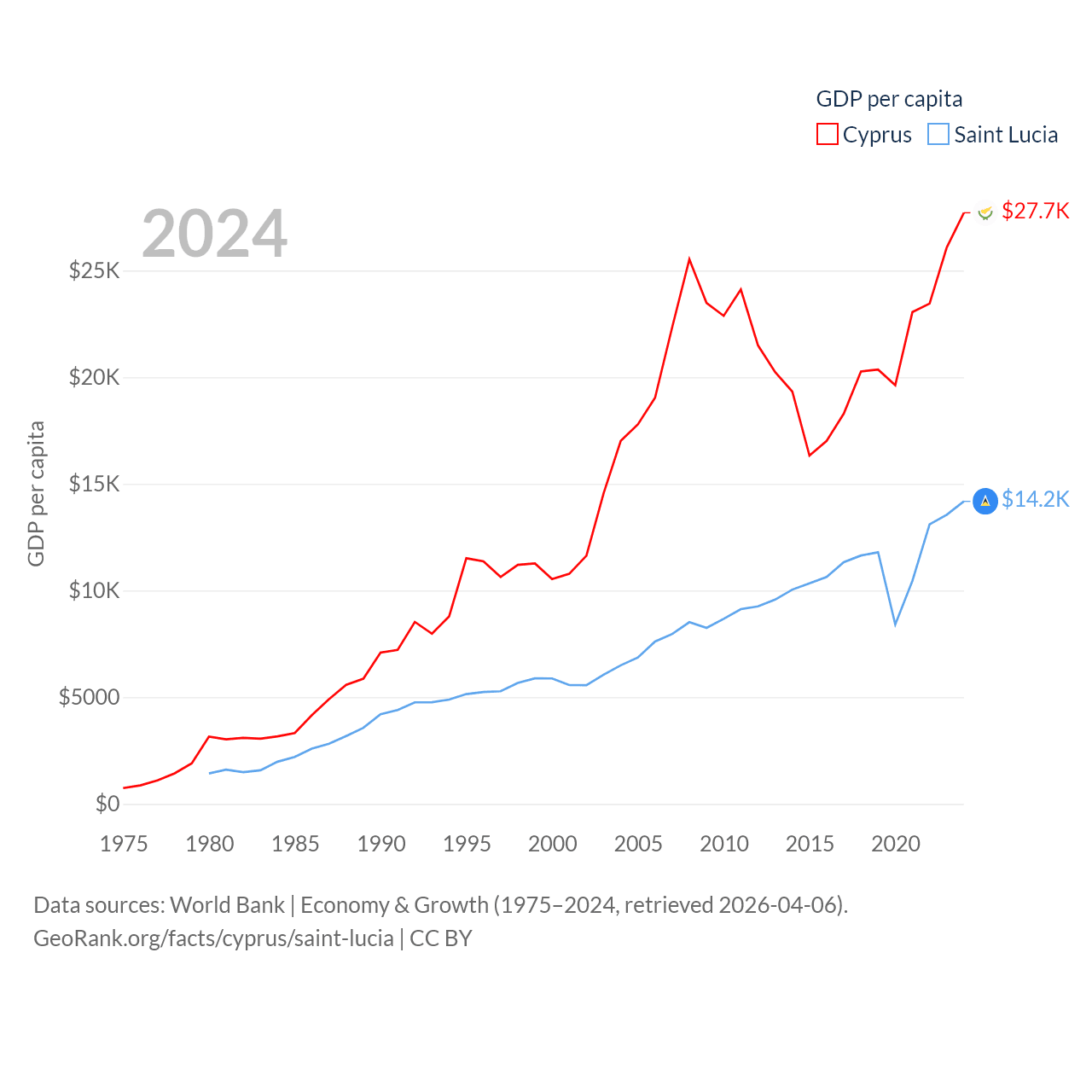 By GDP, Cyprus ranks 103/197 ($37.6B) and Saint Lucia ranks 173/197 ($2.55B). By GDP per capita, Cyprus ranks 45/197 ($27,707), while Saint Lucia ranks 70/197 ($14,182).