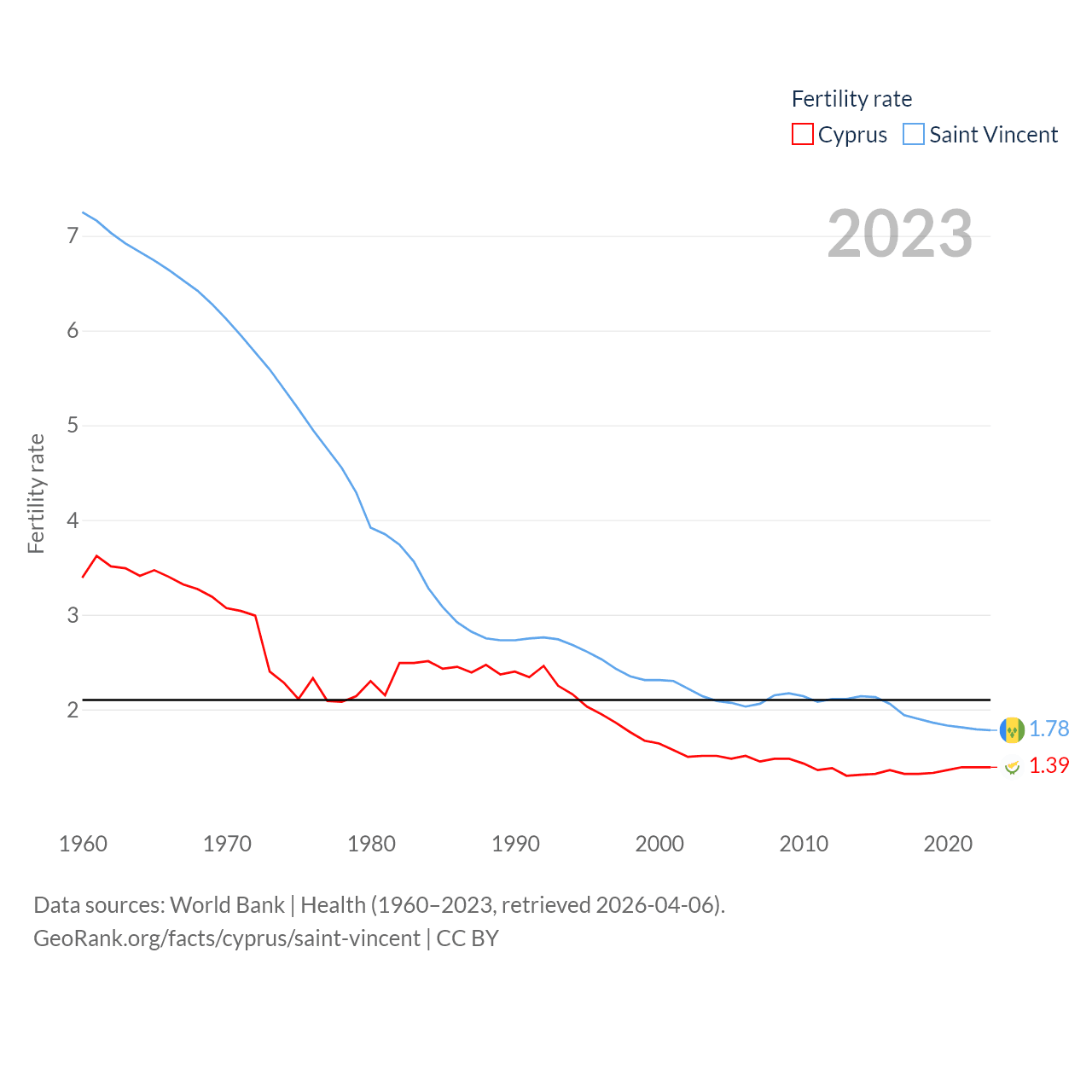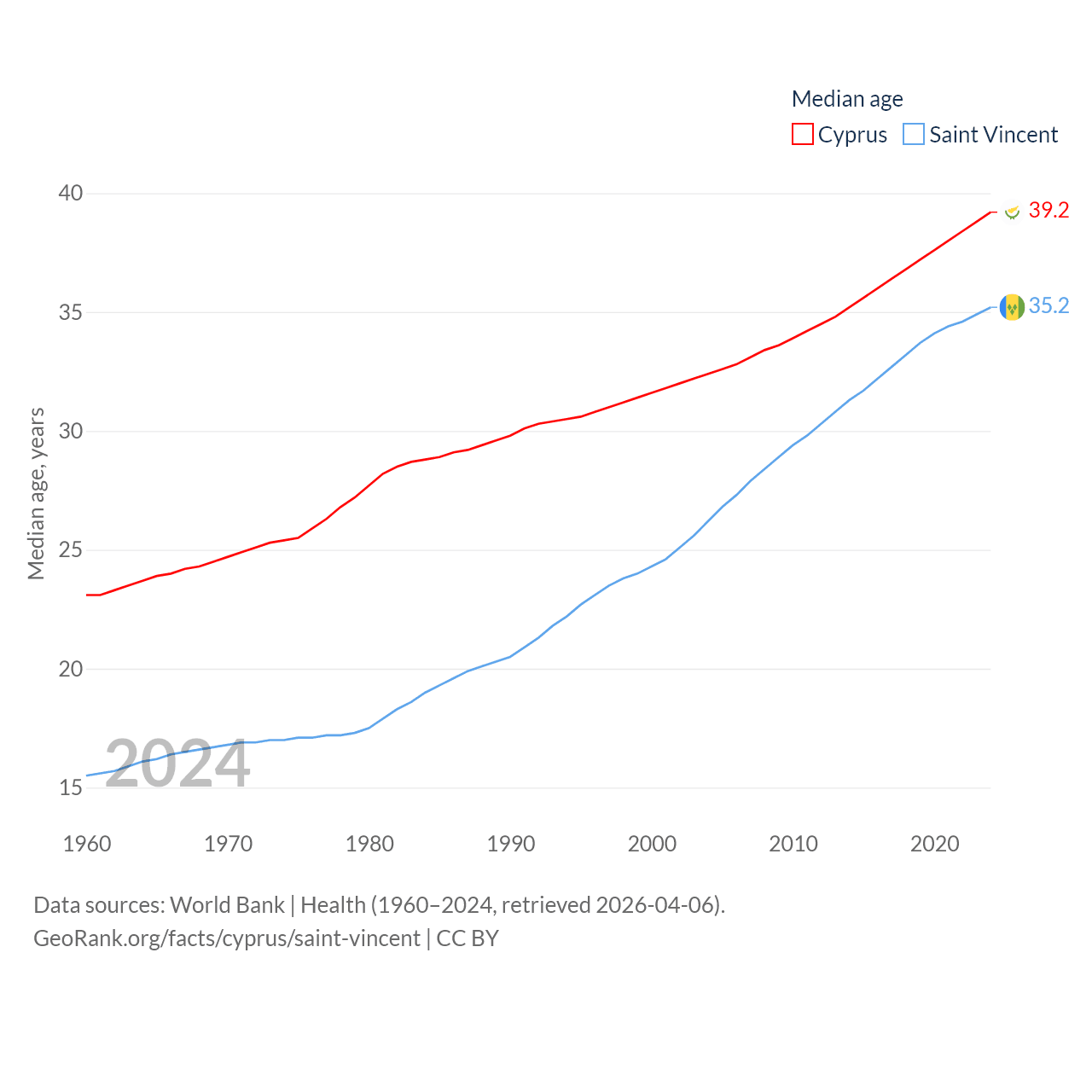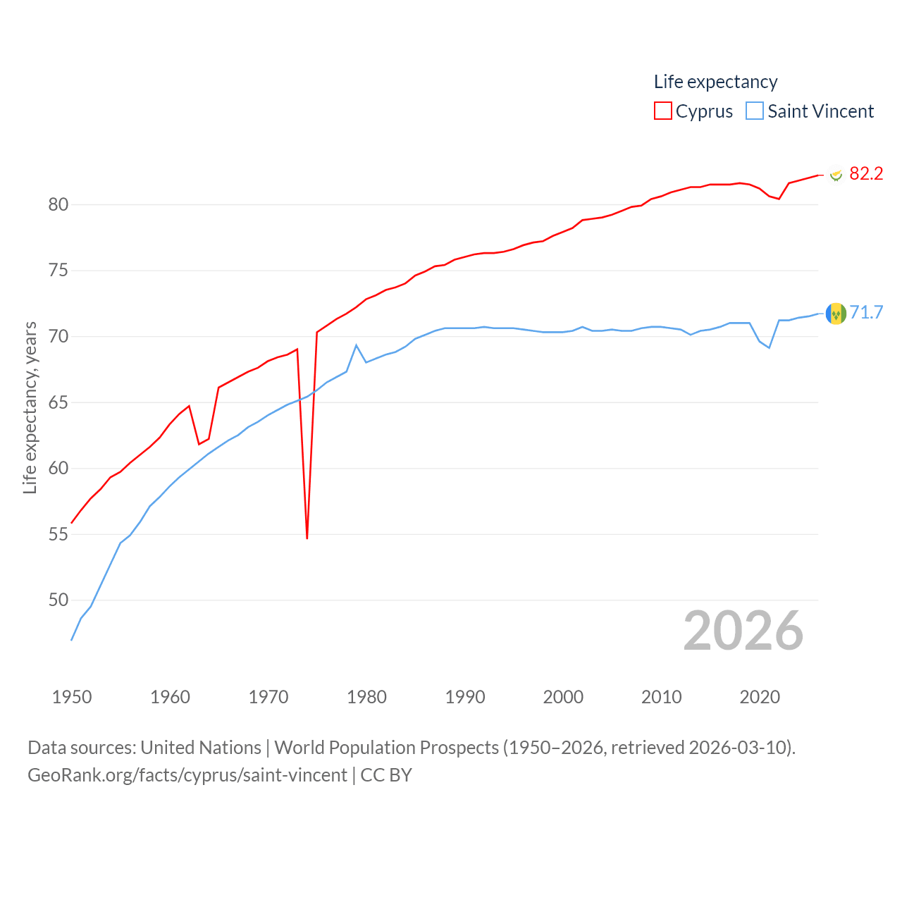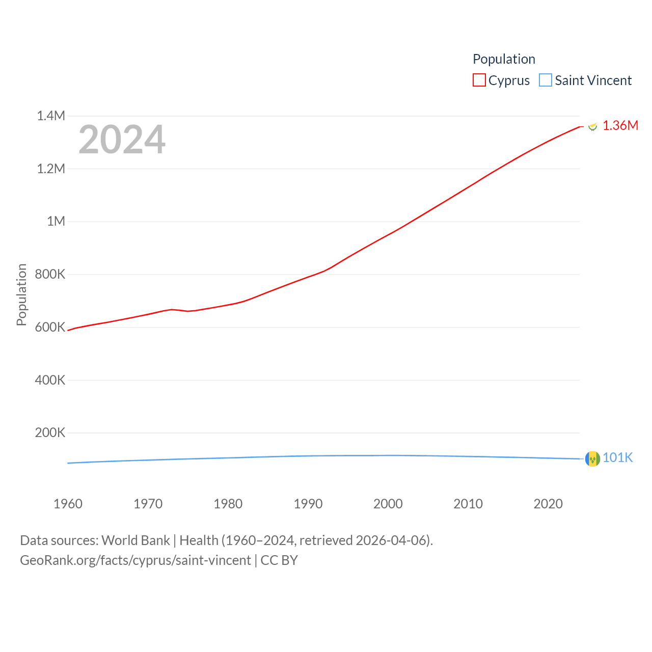 Cyprus has a population of 1.36M (ranked 155/197), compared with 101K in Saint Vincent (ranked 184/197). Cyprus' land area is 3,568 sq mi versus 150.6 sq mi for Saint Vincent (ranked 163rd vs. 185th).