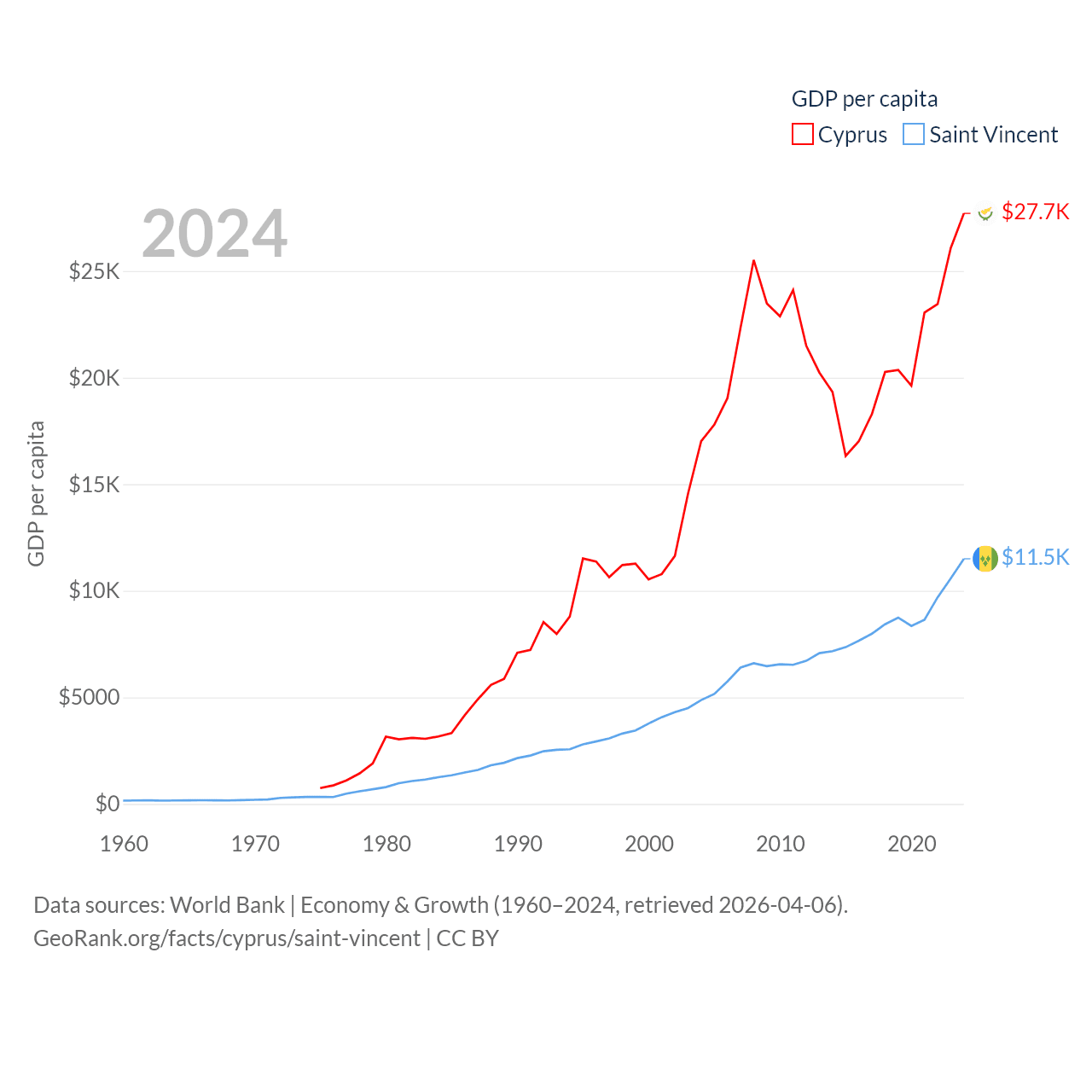 By GDP, Cyprus ranks 103/197 ($37.6B) and Saint Vincent ranks 186/197 ($1.16B). By GDP per capita, Cyprus ranks 45/197 ($27,707), while Saint Vincent ranks 81/197 ($11,501).