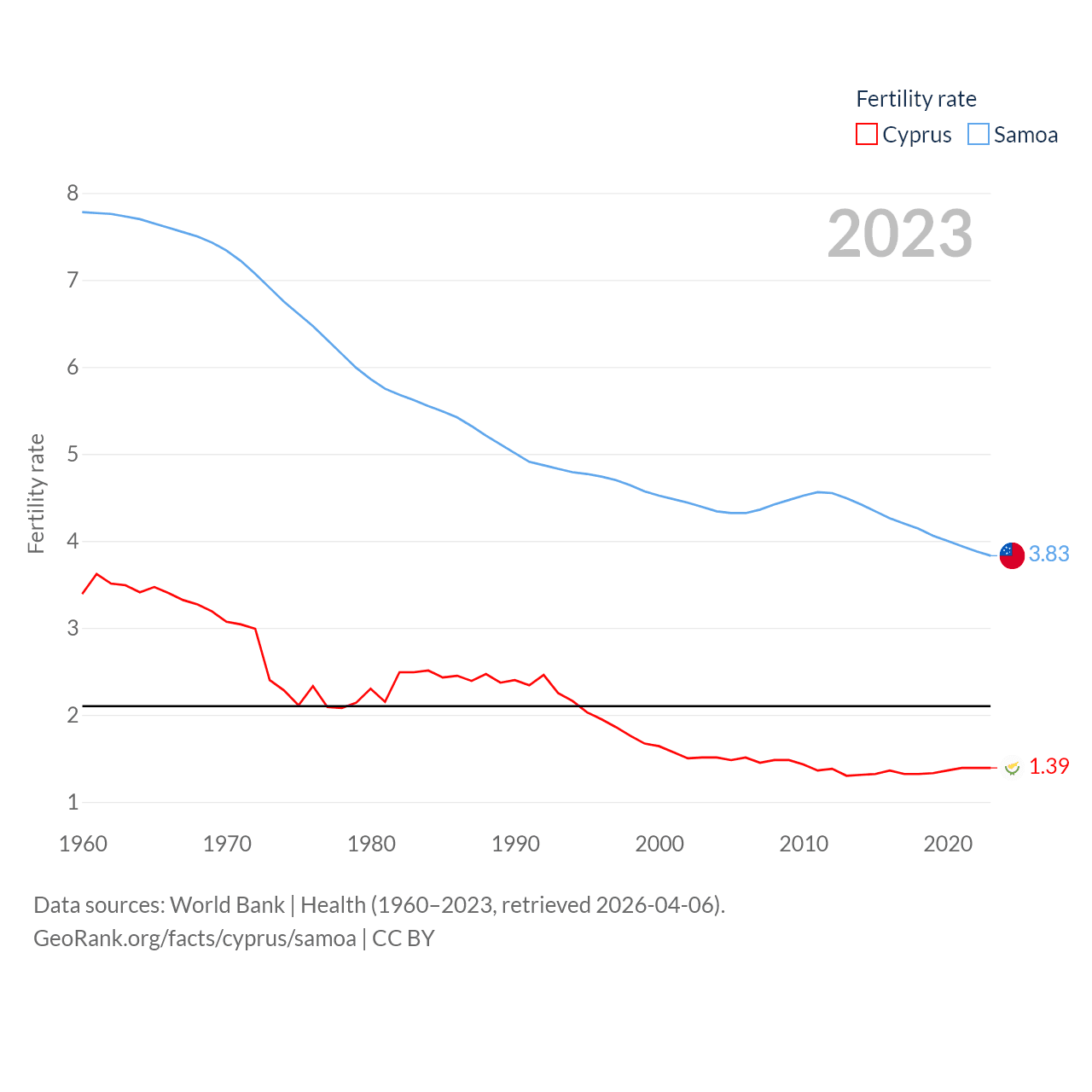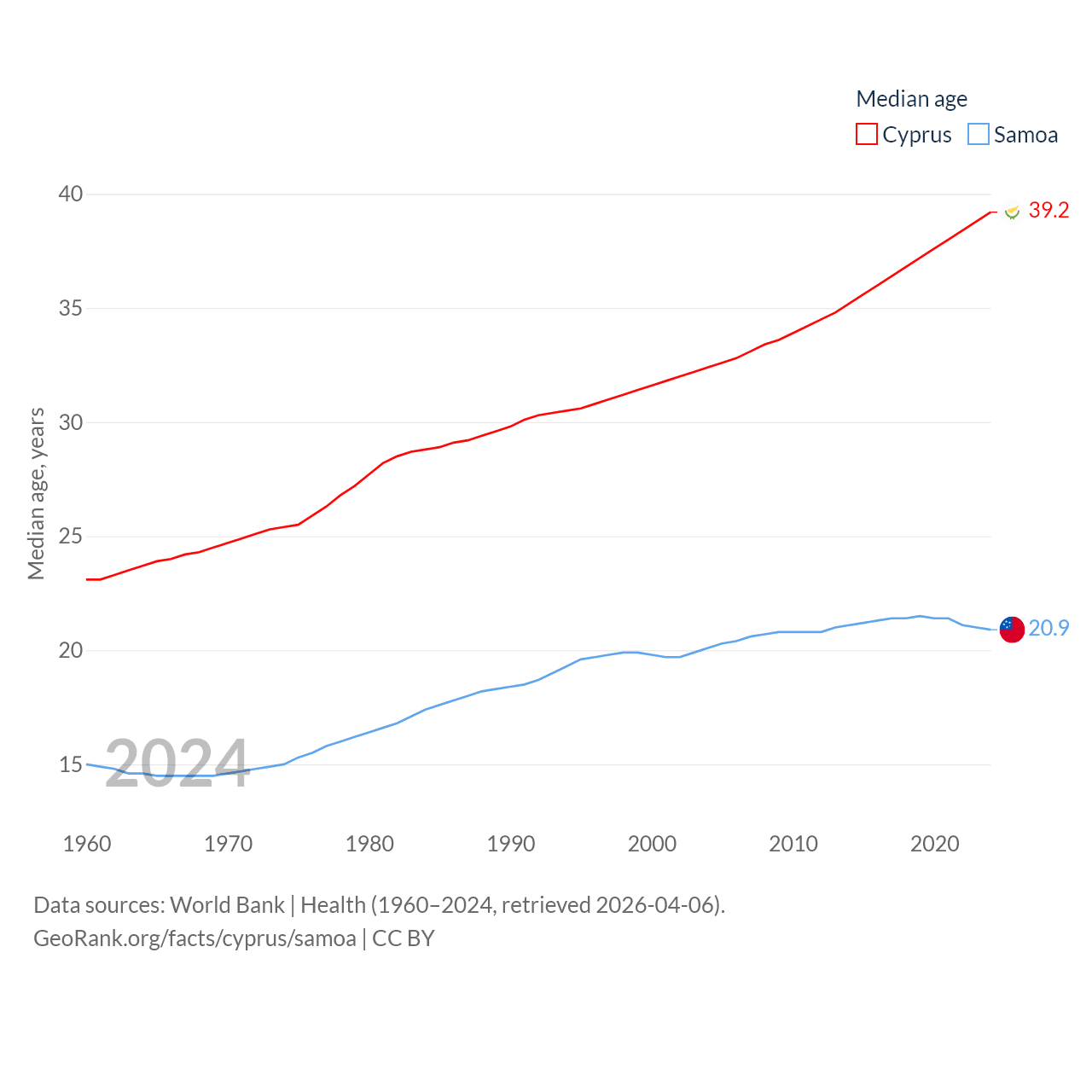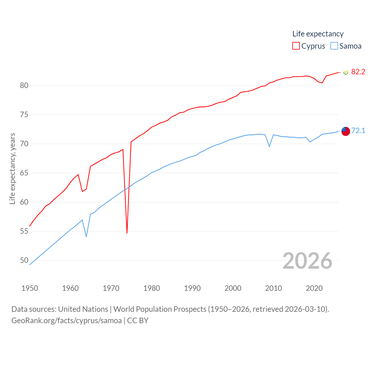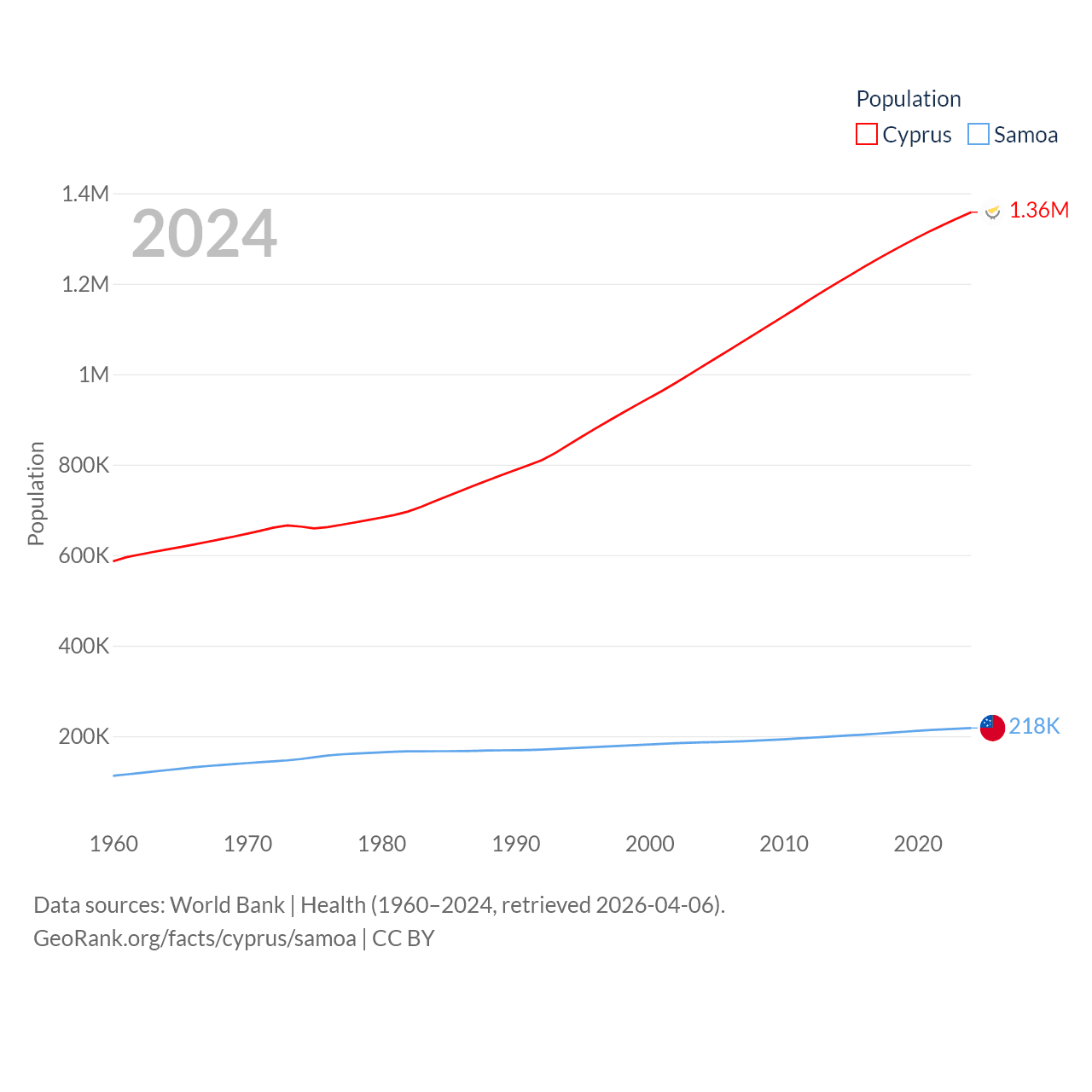 Cyprus has a population of 1.36M (ranked 155/197), compared with 218K in Samoa (ranked 177/197). Cyprus' land area is 3,568 sq mi versus 1,073 sq mi for Samoa (ranked 163rd vs. 168th).