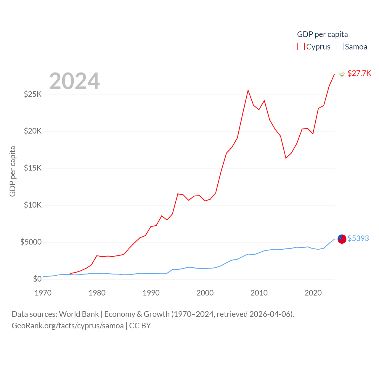 By GDP, Cyprus ranks 103/197 ($37.6B) and Samoa ranks 185/197 ($1.18B). By GDP per capita, Cyprus ranks 45/197 ($27,707), while Samoa ranks 117/197 ($5,393).