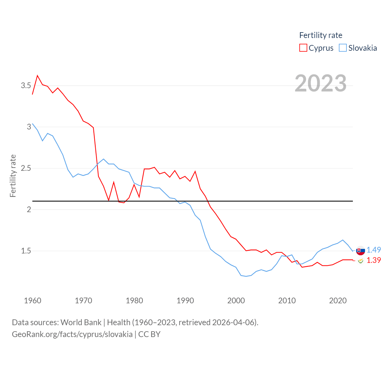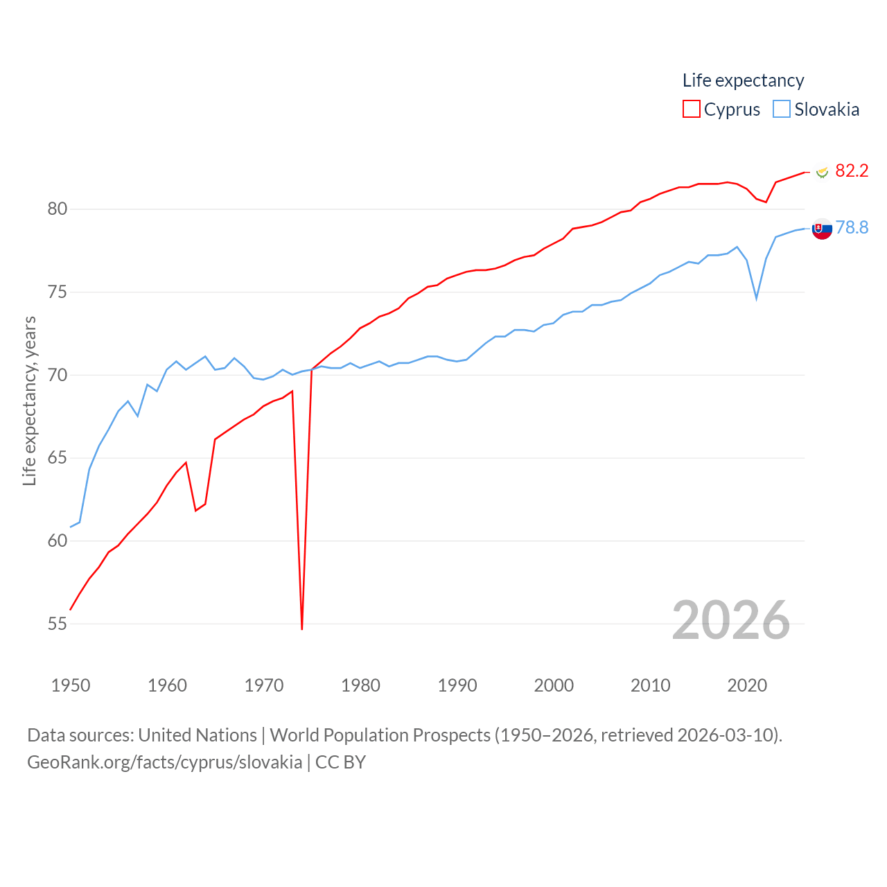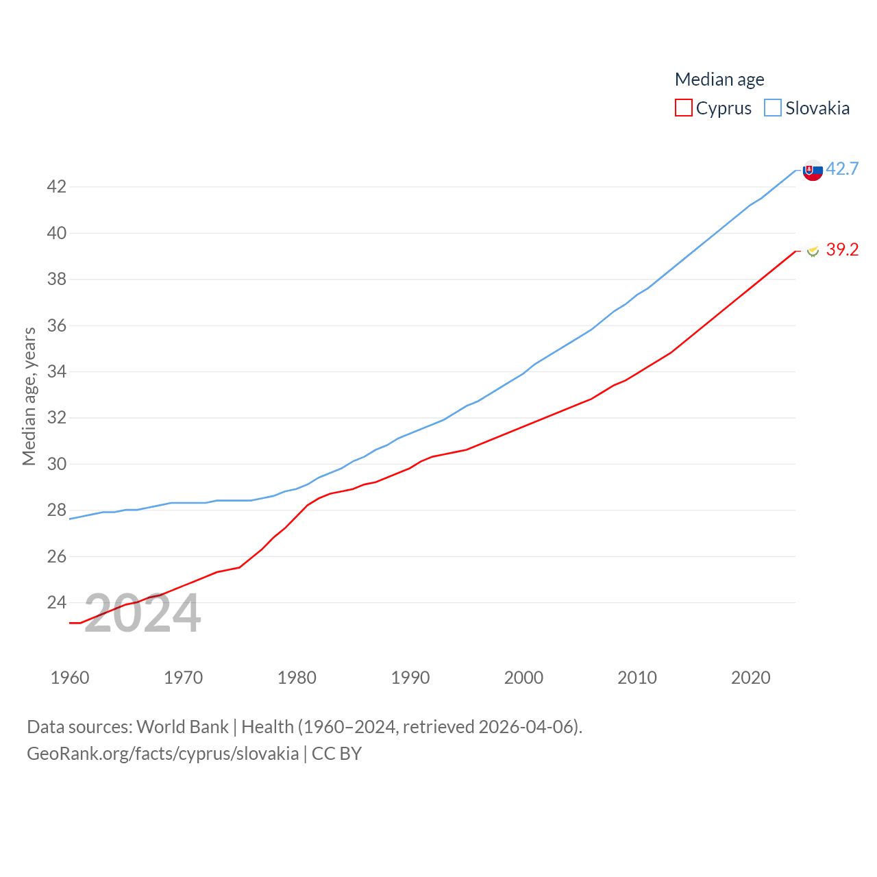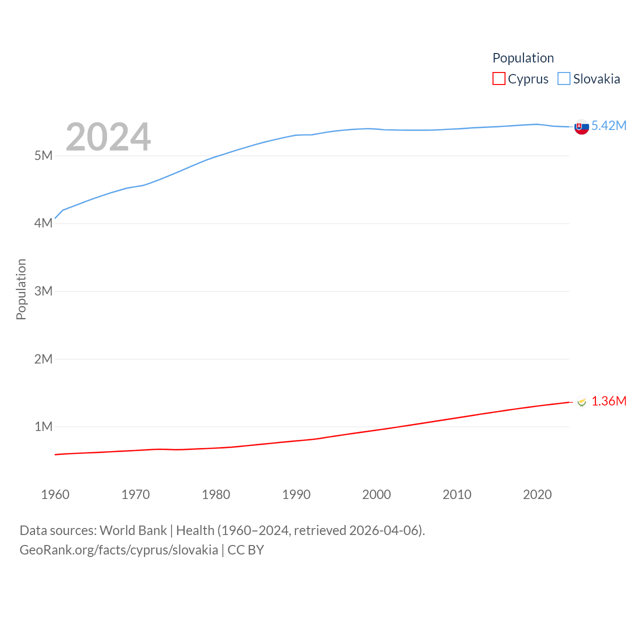 Cyprus has a population of 1.36M (ranked 155/197), compared with 5.42M in Slovakia (ranked 119/197). Cyprus' land area is 3,568 sq mi versus 18,564 sq mi for Slovakia (ranked 163rd vs. 128th).