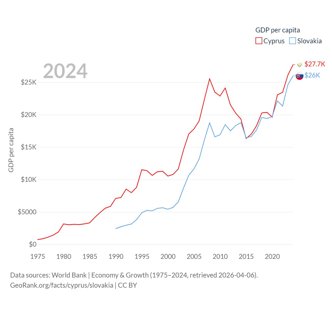 By GDP, Cyprus ranks 103/197 ($37.6B) and Slovakia ranks 61/197 ($141B). By GDP per capita, Cyprus ranks 45/197 ($27,707), while Slovakia ranks 47/197 ($25,993).