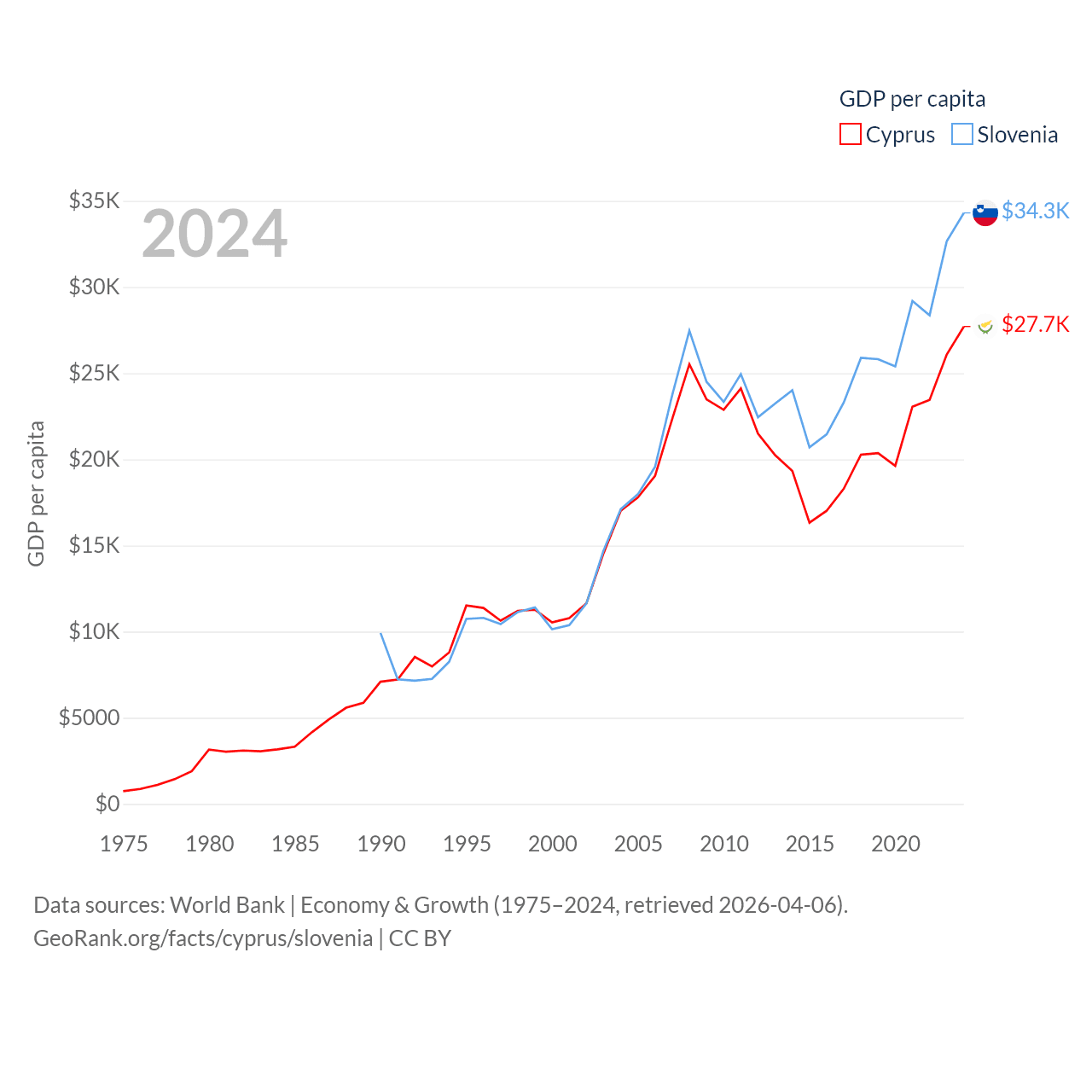 By GDP, Cyprus ranks 103/197 ($37.6B) and Slovenia ranks 86/197 ($73B). By GDP per capita, Cyprus ranks 45/197 ($27,707), while Slovenia ranks 34/197 ($34,301).