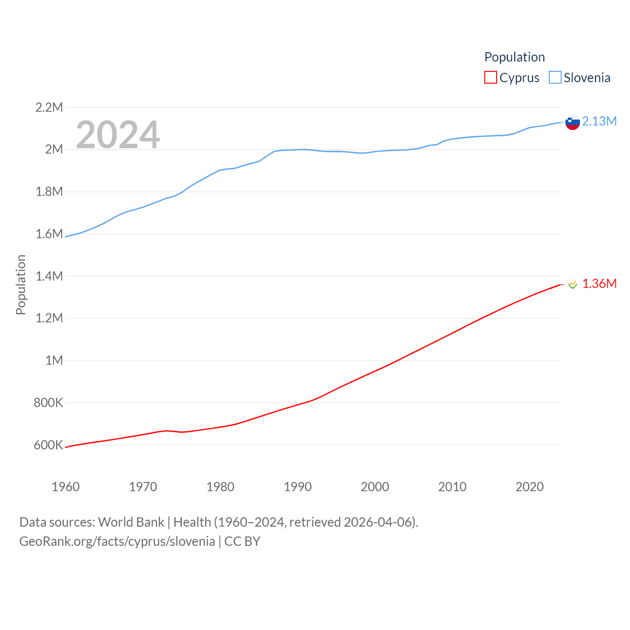 Cyprus has a population of 1.36M (ranked 155/197), compared with 2.13M in Slovenia (ranked 147/197). Cyprus' land area is 3,568 sq mi versus 7,774 sq mi for Slovenia (ranked 163rd vs. 151st).