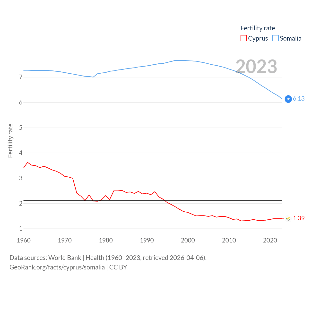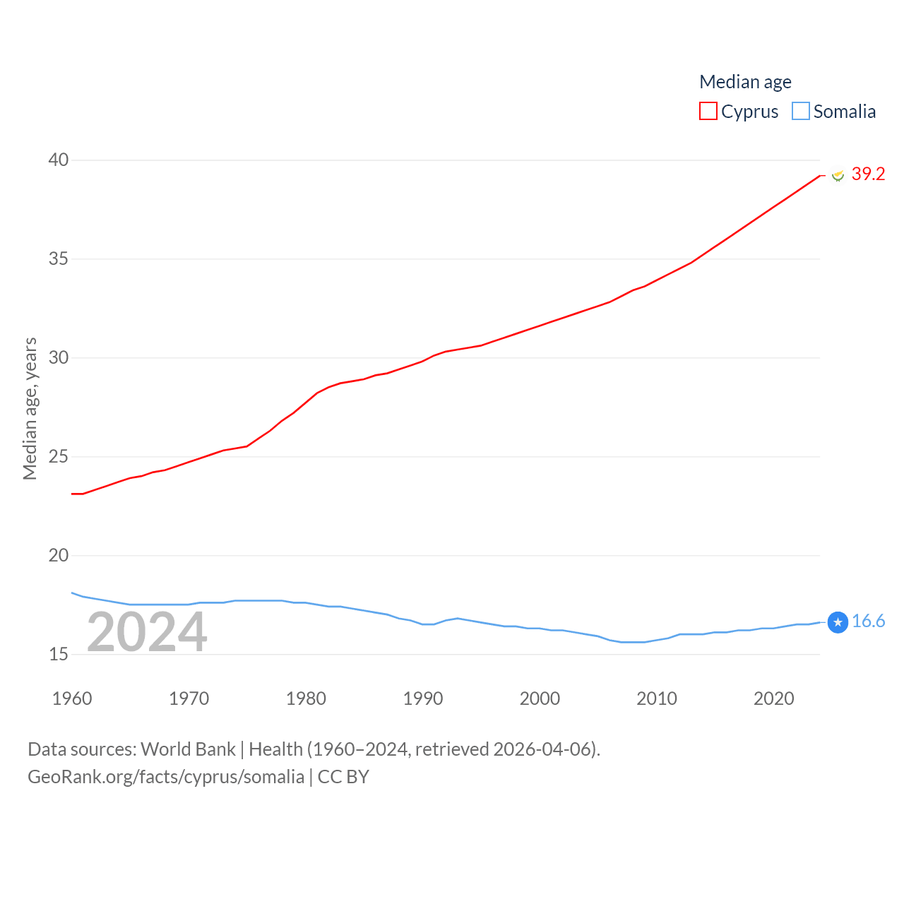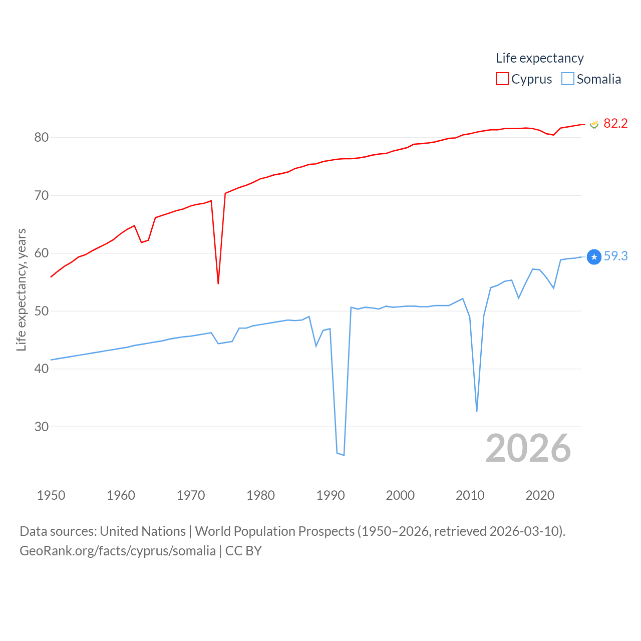 Cyprus has a population of 1.36M (ranked 155/197), compared with 19M in Somalia (ranked 68/197). Cyprus' land area is 3,568 sq mi versus 242,217 sq mi for Somalia (ranked 163rd vs. 42nd).