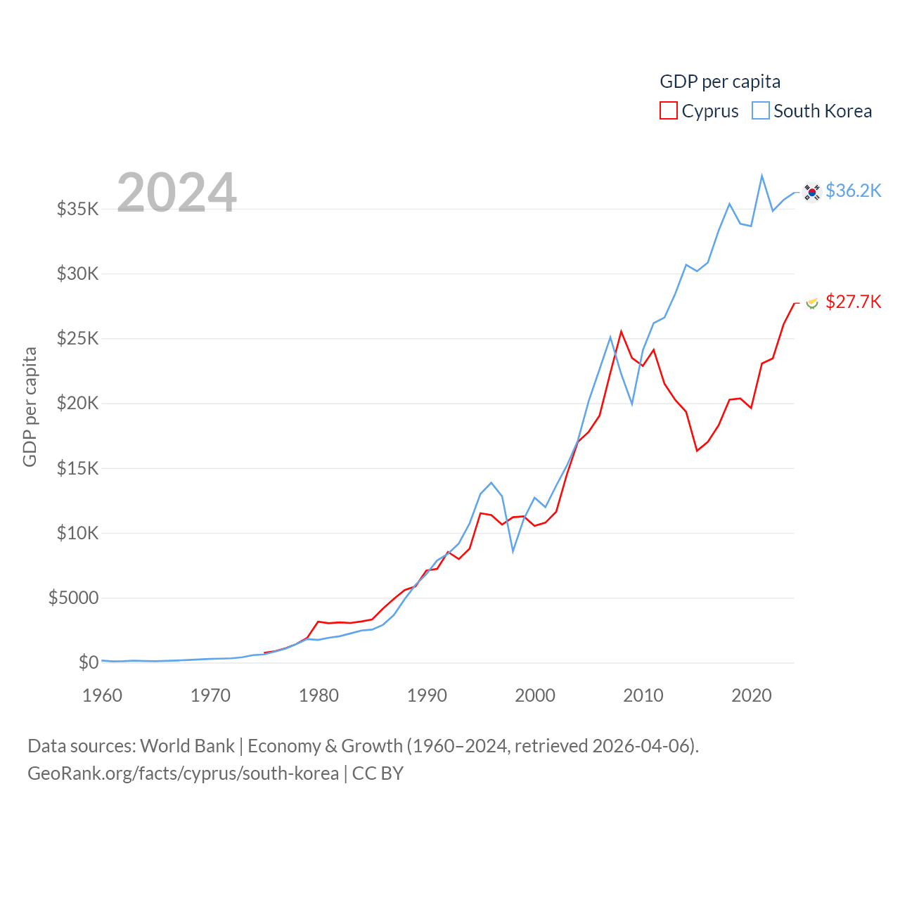 By GDP, Cyprus ranks 103/197 ($37.6B) and South Korea ranks 12/197 ($1.88T). By GDP per capita, Cyprus ranks 45/197 ($27,707), while South Korea ranks 31/197 ($36,239).