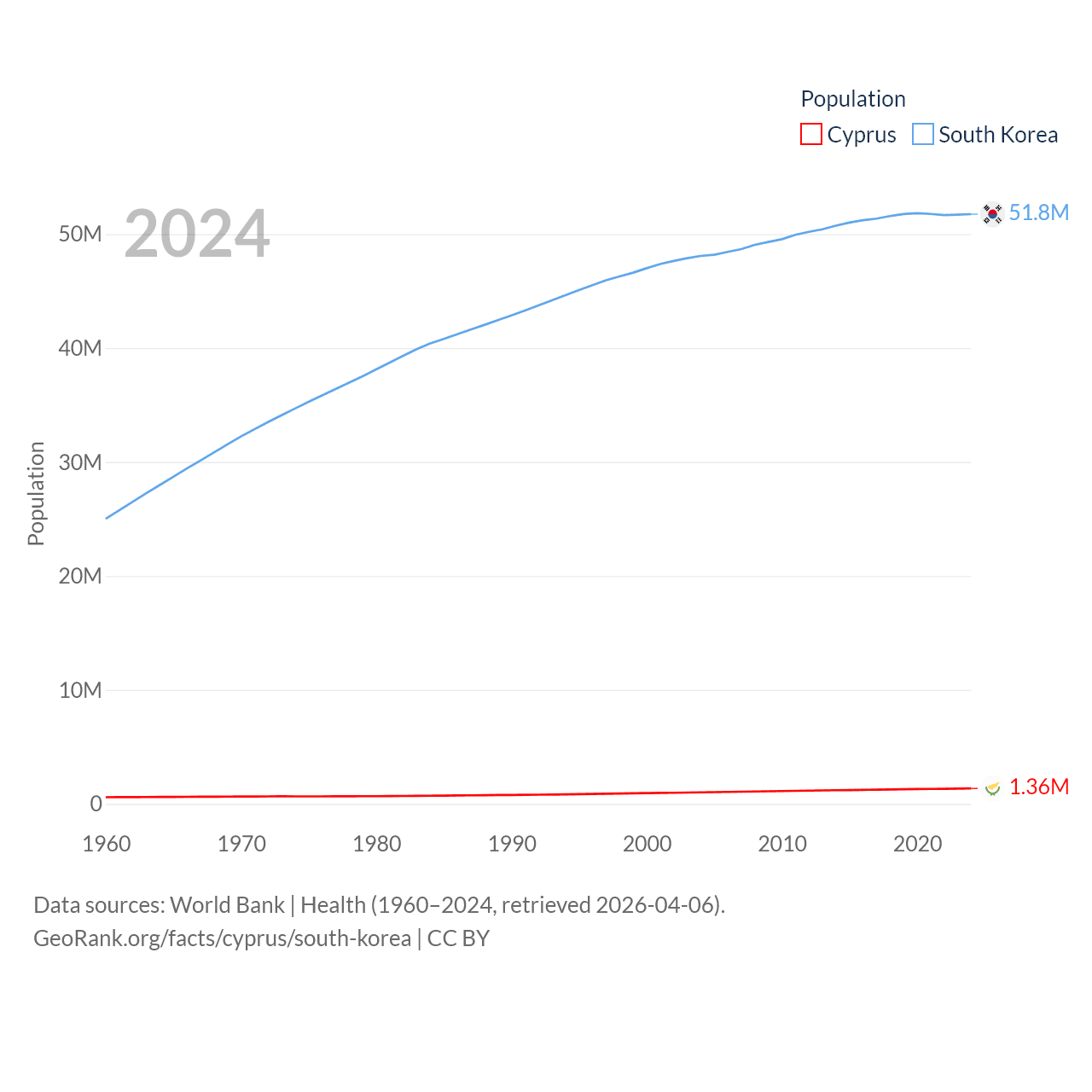 Cyprus has a population of 1.36M (ranked 155/197), compared with 51.8M in South Korea (ranked 29/197). Cyprus' land area is 3,568 sq mi versus 37,684 sq mi for South Korea (ranked 163rd vs. 105th).