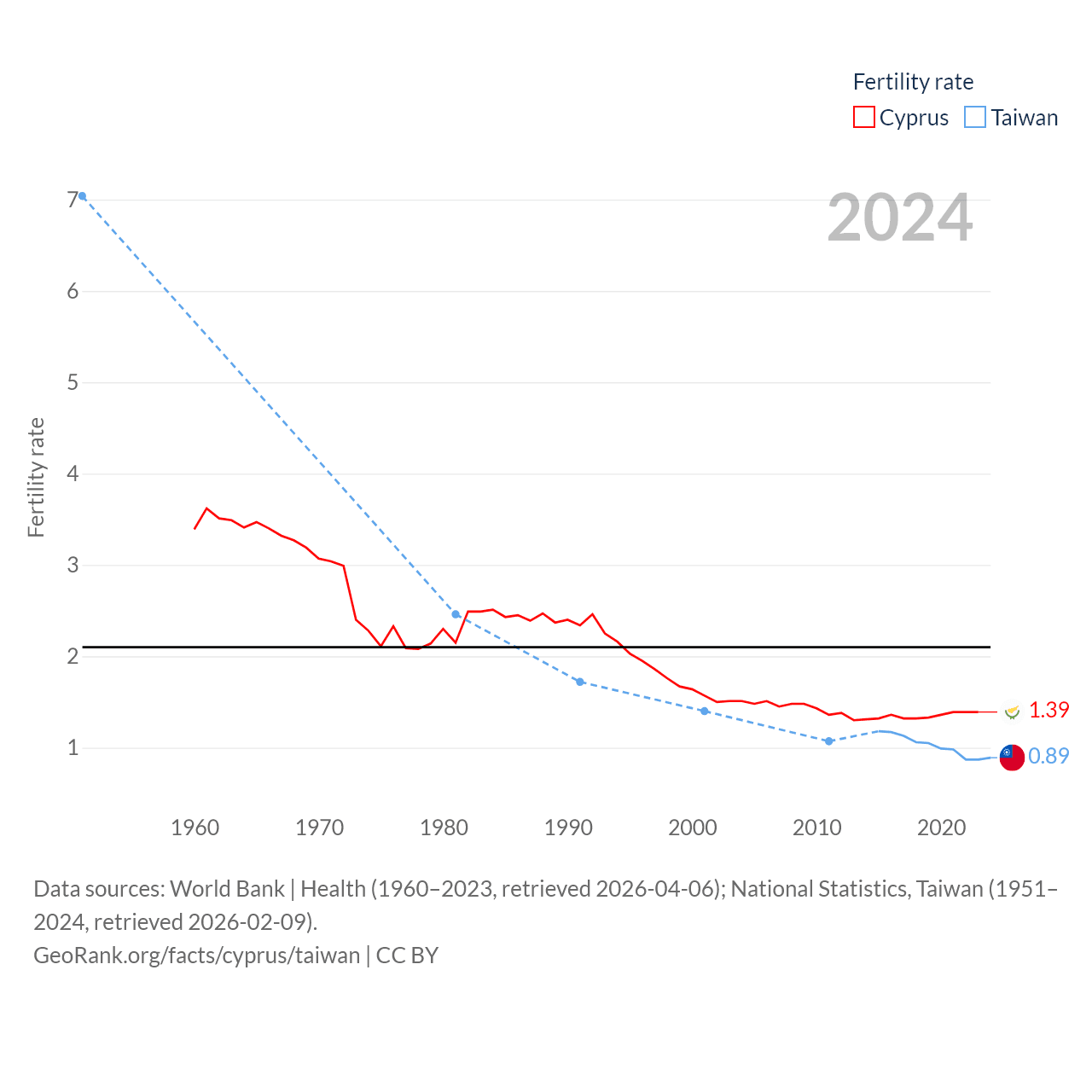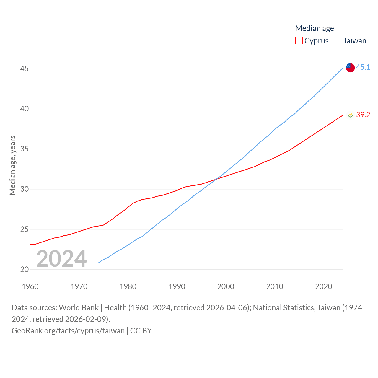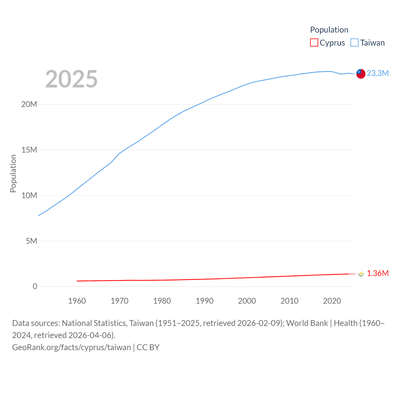 Cyprus has a population of 1.36M (ranked 155/197), compared with 23.3M in Taiwan (ranked 60/197). Cyprus' land area is 3,568 sq mi versus 13,976 sq mi for Taiwan (ranked 163rd vs. 133rd).