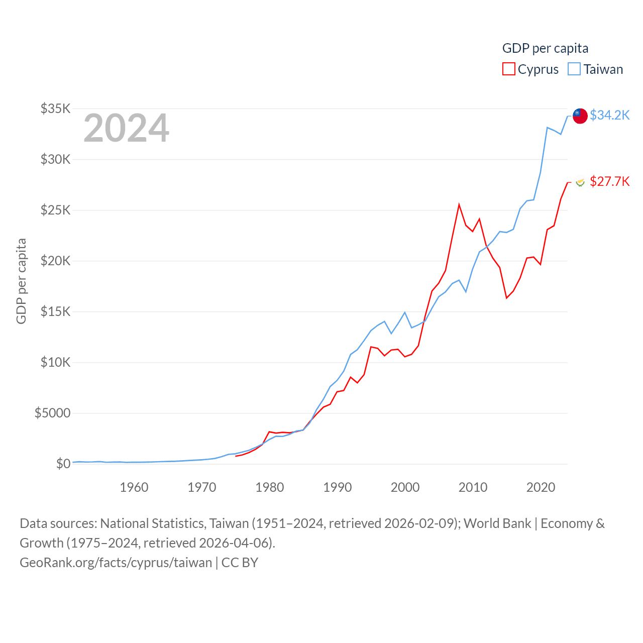 By GDP, Cyprus ranks 103/197 ($37.6B) and Taiwan ranks 22/197 ($802B). By GDP per capita, Cyprus ranks 45/197 ($27,707), while Taiwan ranks 35/197 ($34,238).