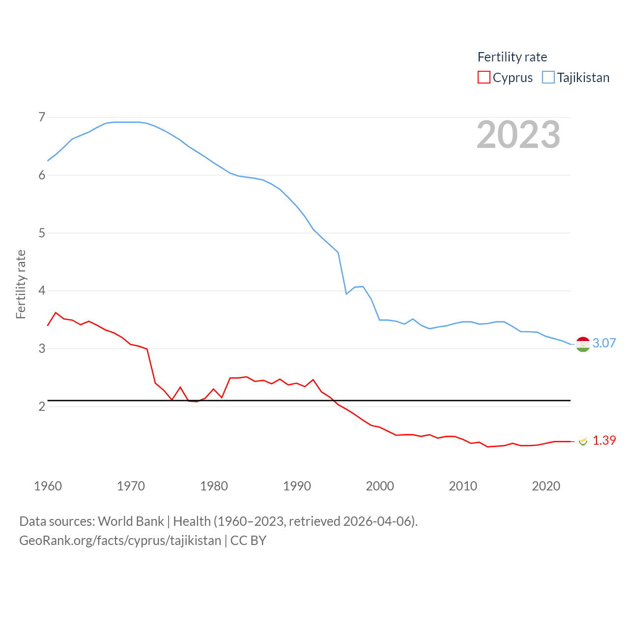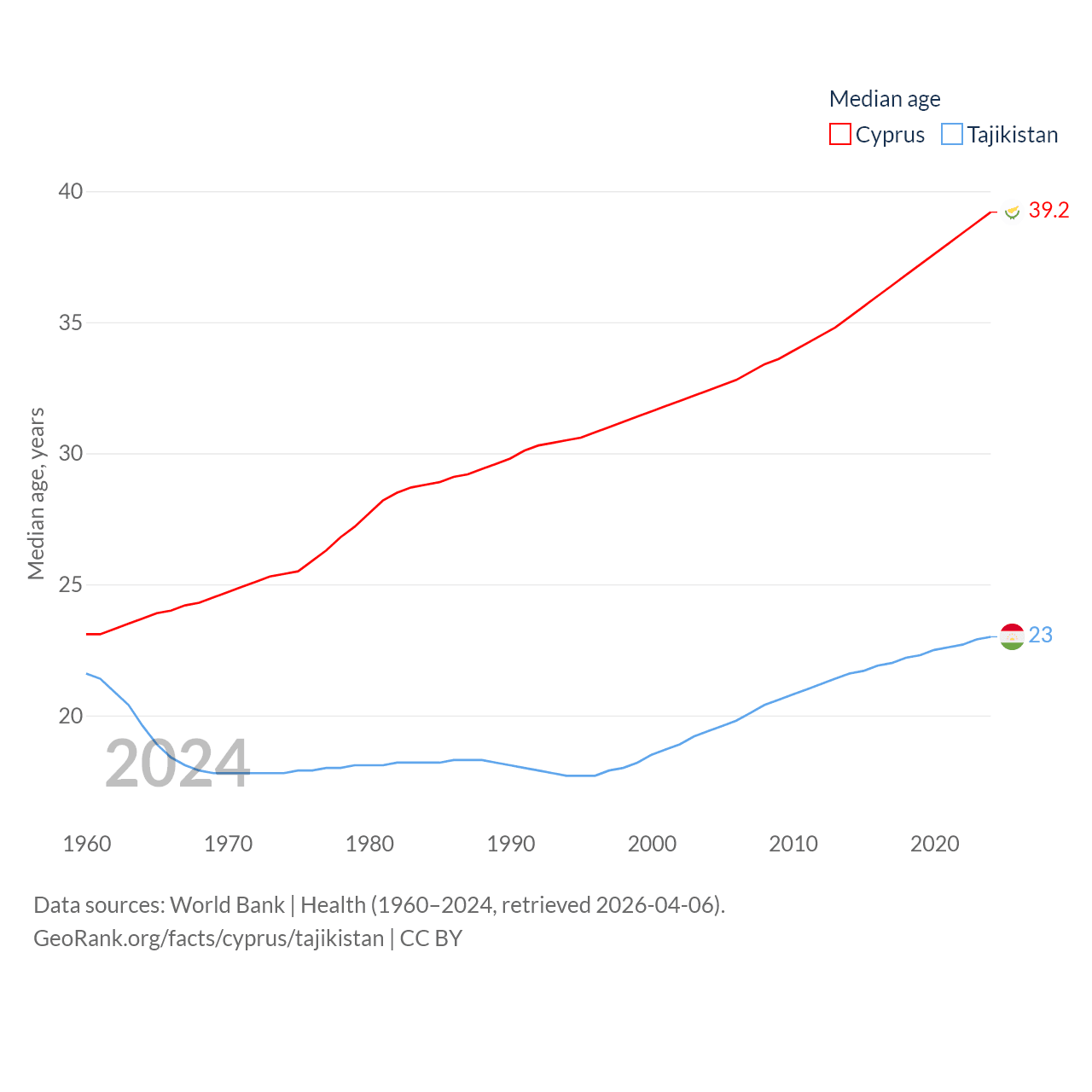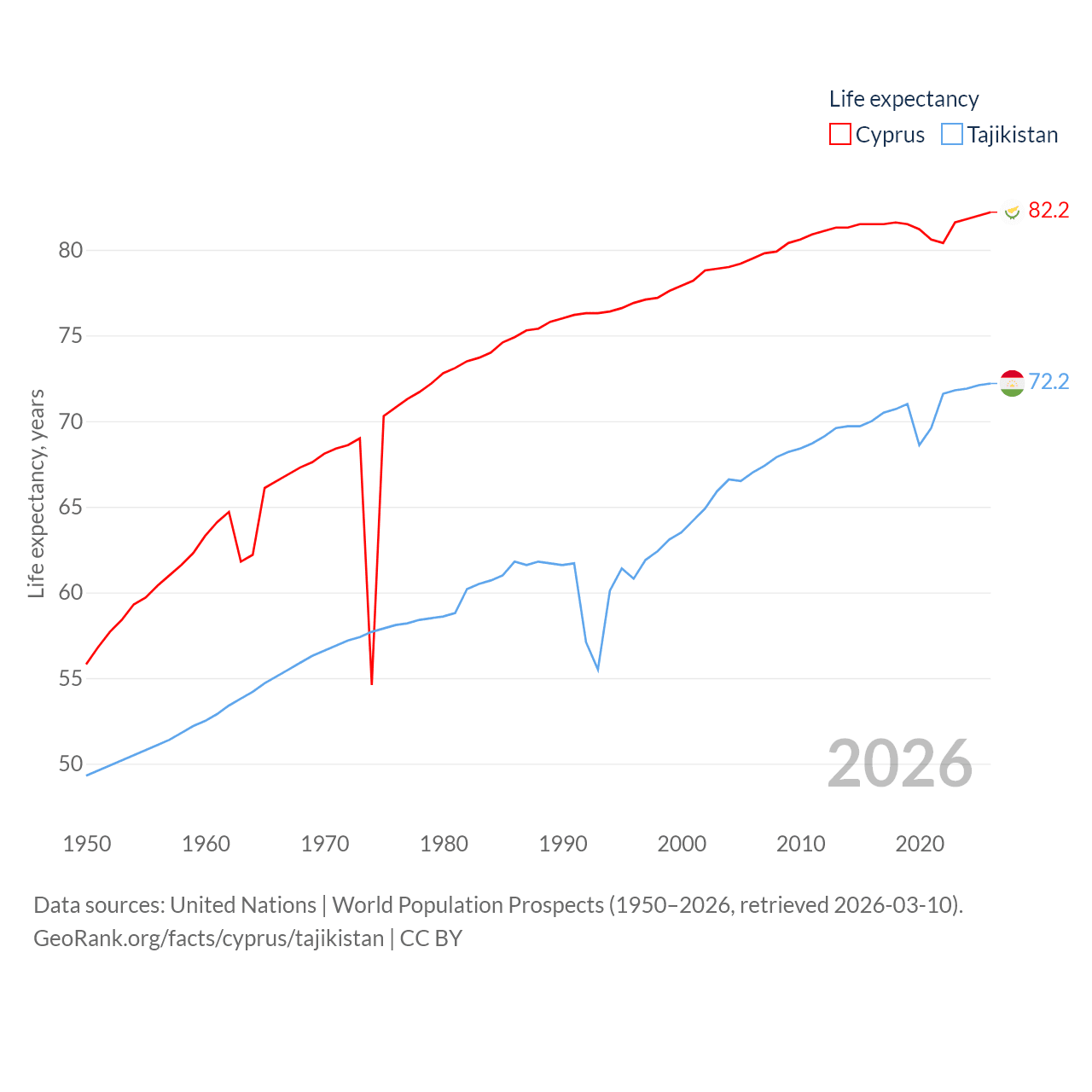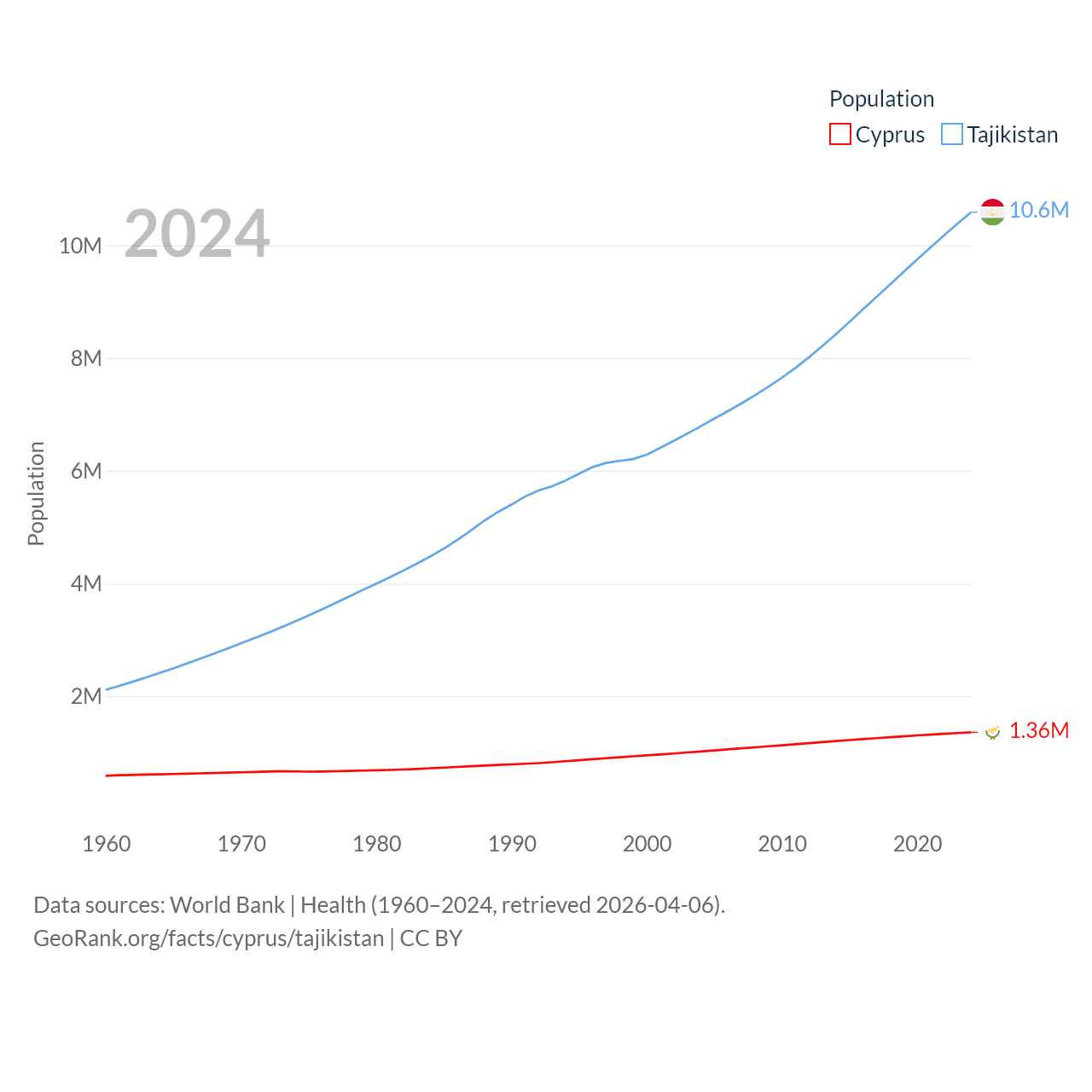 Cyprus has a population of 1.36M (ranked 155/197), compared with 10.6M in Tajikistan (ranked 91/197). Cyprus' land area is 3,568 sq mi versus 53,587 sq mi for Tajikistan (ranked 163rd vs. 93rd).