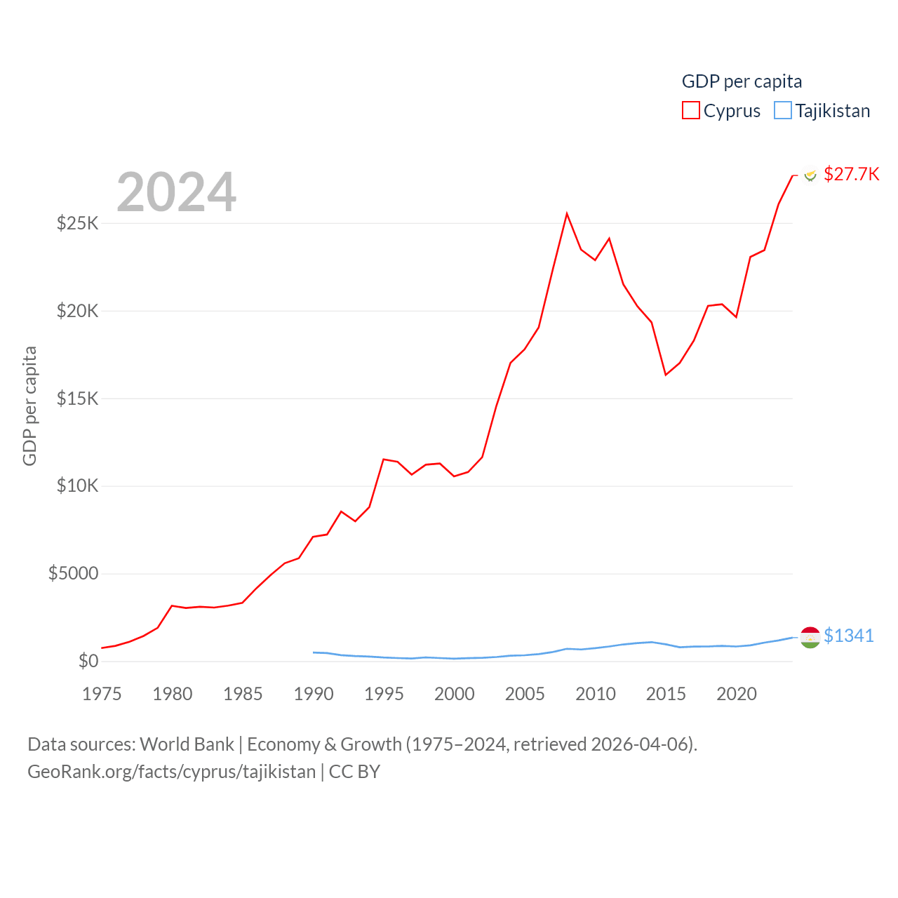 By GDP, Cyprus ranks 103/197 ($37.6B) and Tajikistan ranks 145/197 ($14.2B). By GDP per capita, Cyprus ranks 45/197 ($27,707), while Tajikistan ranks 166/197 ($1,341).