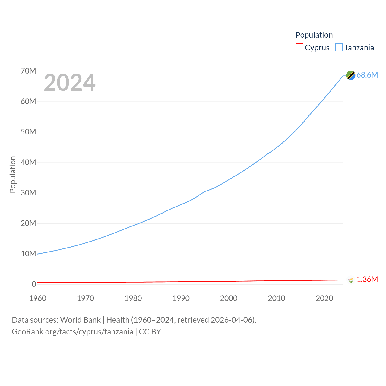 Cyprus has a population of 1.36M (ranked 155/197), compared with 68.6M in Tanzania (ranked 22/197). Cyprus' land area is 3,568 sq mi versus 342,009 sq mi for Tanzania (ranked 163rd vs. 31st).