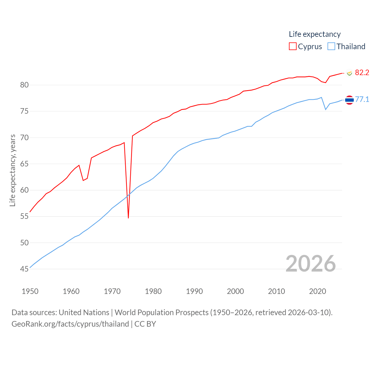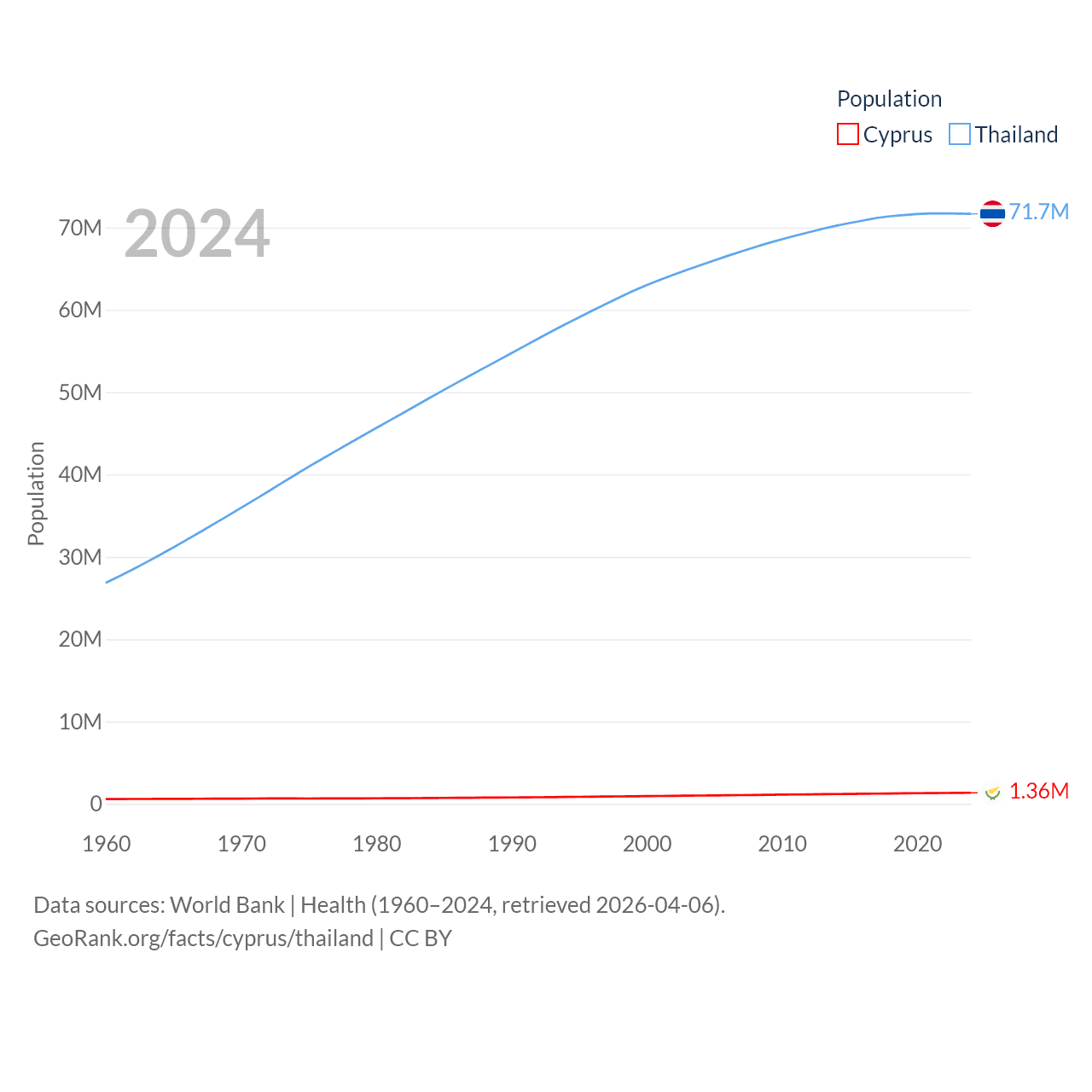 Cyprus has a population of 1.36M (ranked 155/197), compared with 71.7M in Thailand (ranked 20/197). Cyprus' land area is 3,568 sq mi versus 197,256 sq mi for Thailand (ranked 163rd vs. 50th).
