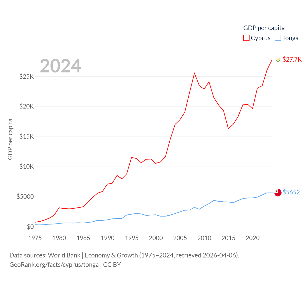 By GDP, Cyprus ranks 103/197 ($37.6B) and Tonga ranks 191/197 ($591M). By GDP per capita, Cyprus ranks 45/197 ($27,707), while Tonga ranks 115/197 ($5,652).