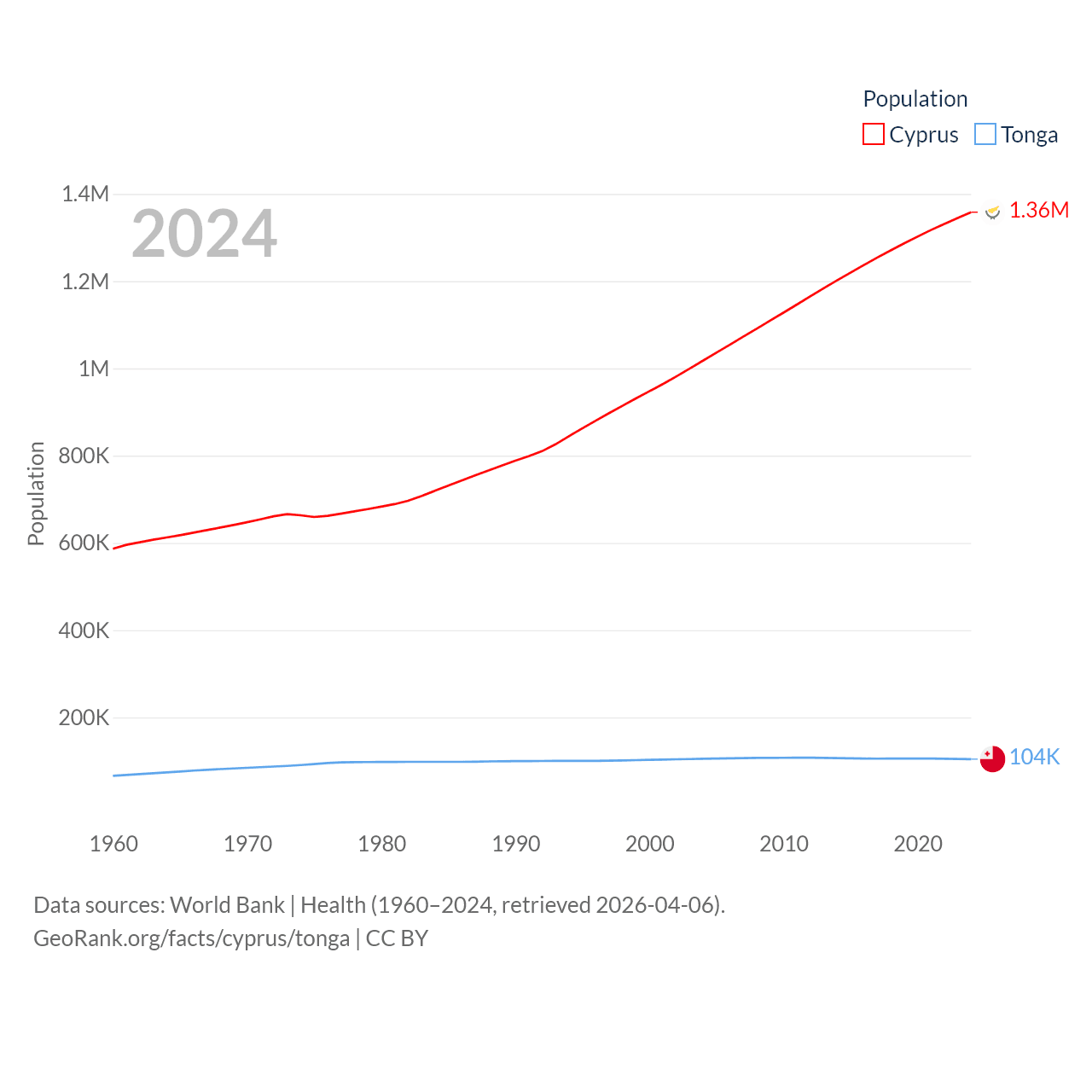 Cyprus has a population of 1.36M (ranked 155/197), compared with 104K in Tonga (ranked 183/197). Cyprus' land area is 3,568 sq mi versus 278 sq mi for Tonga (ranked 163rd vs. 176th).