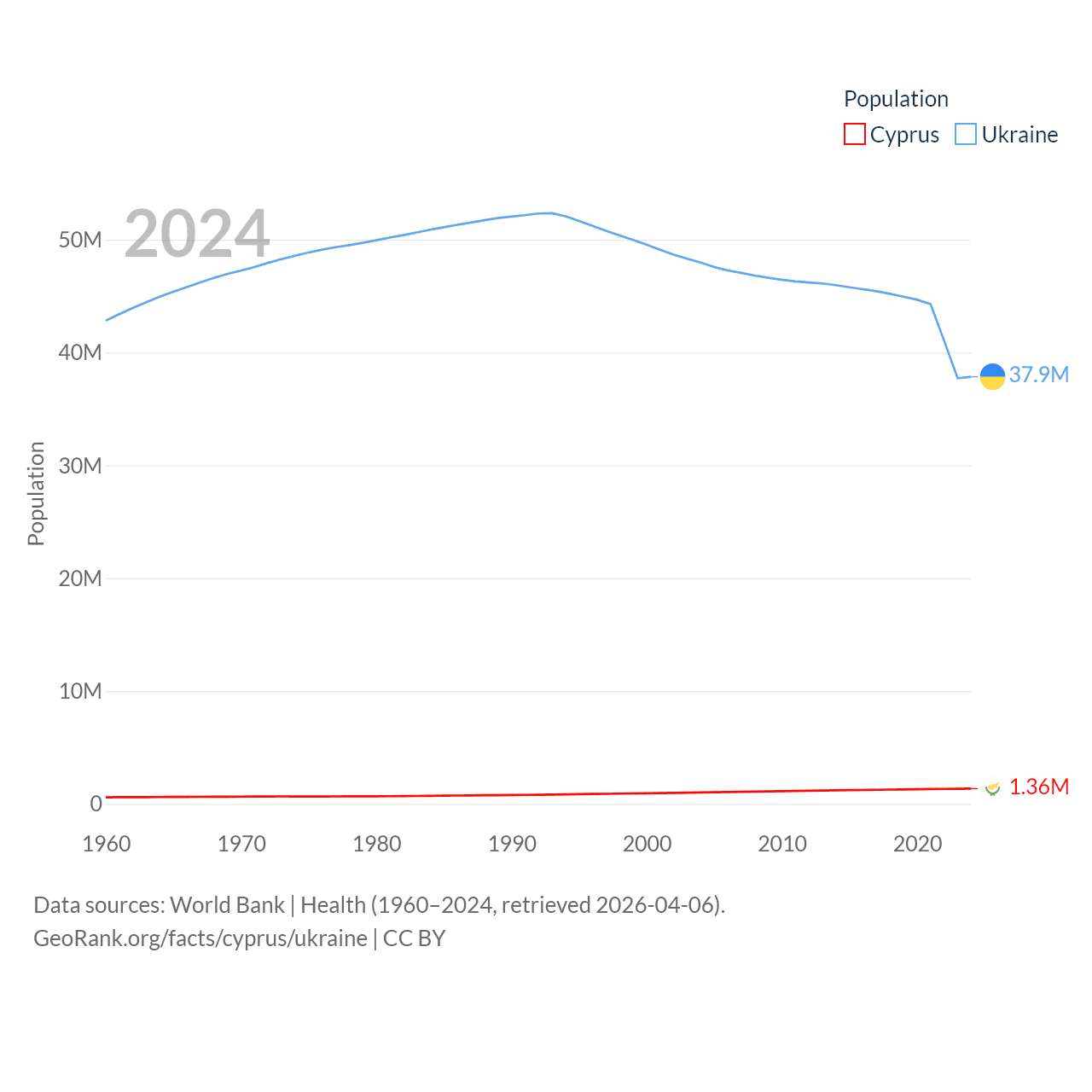 Cyprus has a population of 1.36M (ranked 155/197), compared with 37.9M in Ukraine (ranked 41/197). Cyprus' land area is 3,568 sq mi versus 223,708 sq mi for Ukraine (ranked 163rd vs. 46th).