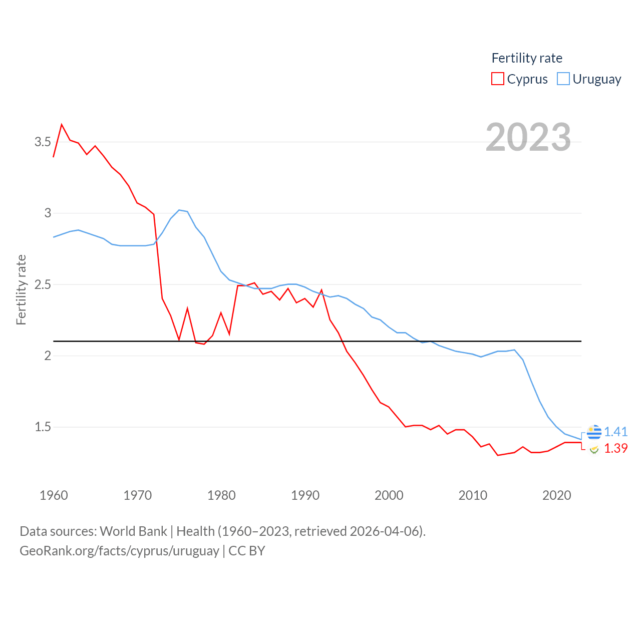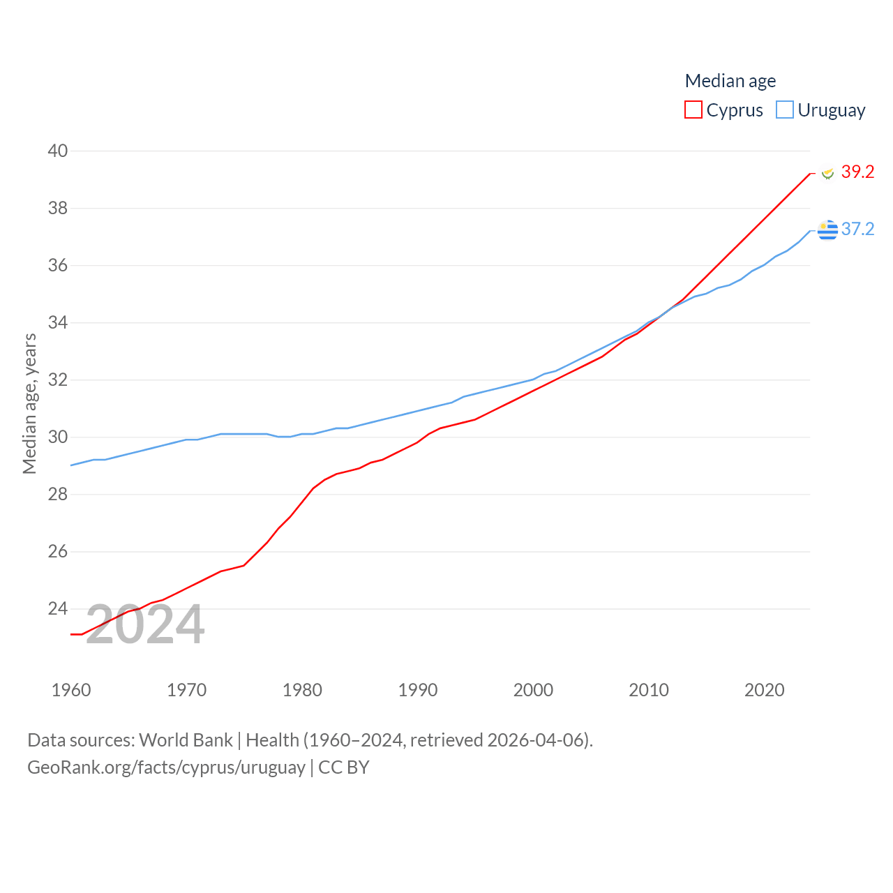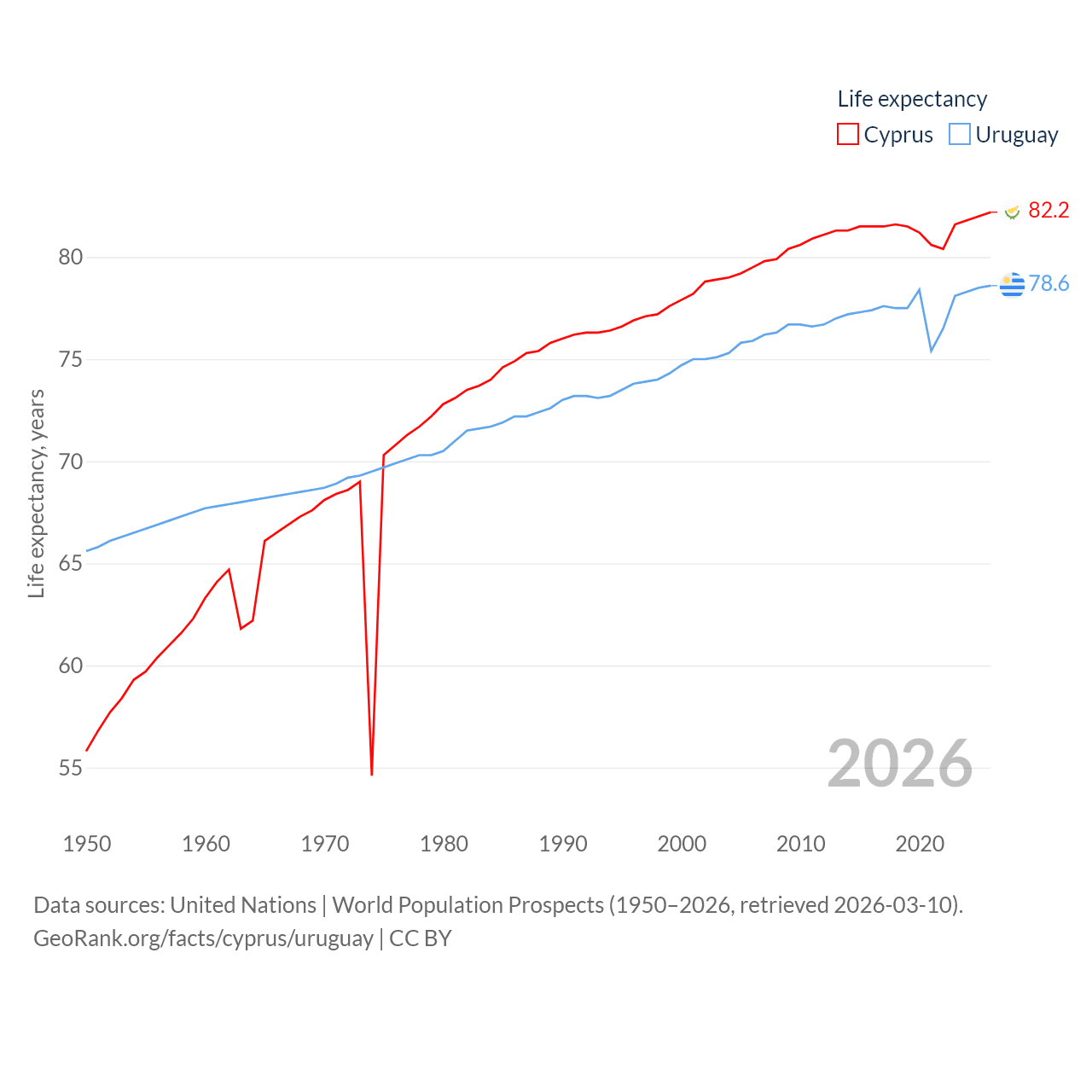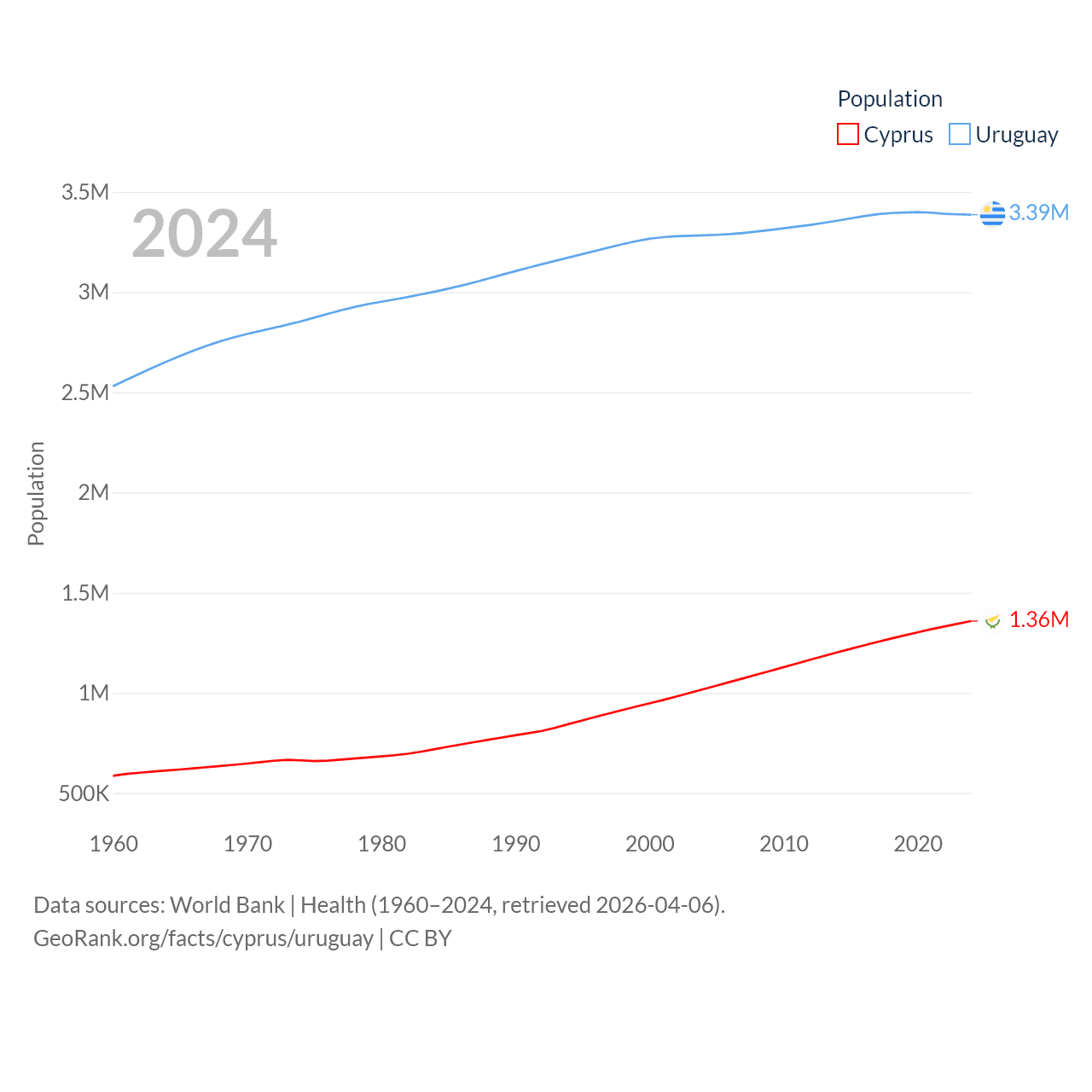 Cyprus has a population of 1.36M (ranked 155/197), compared with 3.39M in Uruguay (ranked 133/197). Cyprus' land area is 3,568 sq mi versus 67,576 sq mi for Uruguay (ranked 163rd vs. 89th).