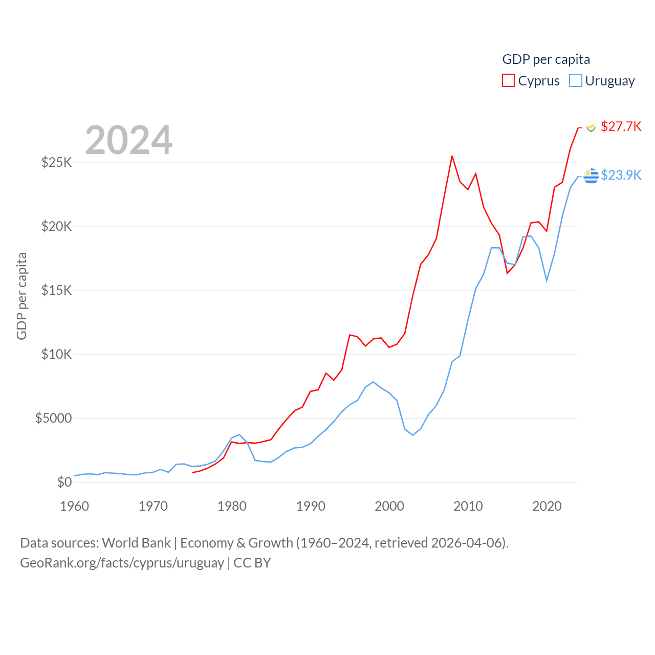 By GDP, Cyprus ranks 103/197 ($37.6B) and Uruguay ranks 81/197 ($81B). By GDP per capita, Cyprus ranks 45/197 ($27,707), while Uruguay ranks 52/197 ($23,907).