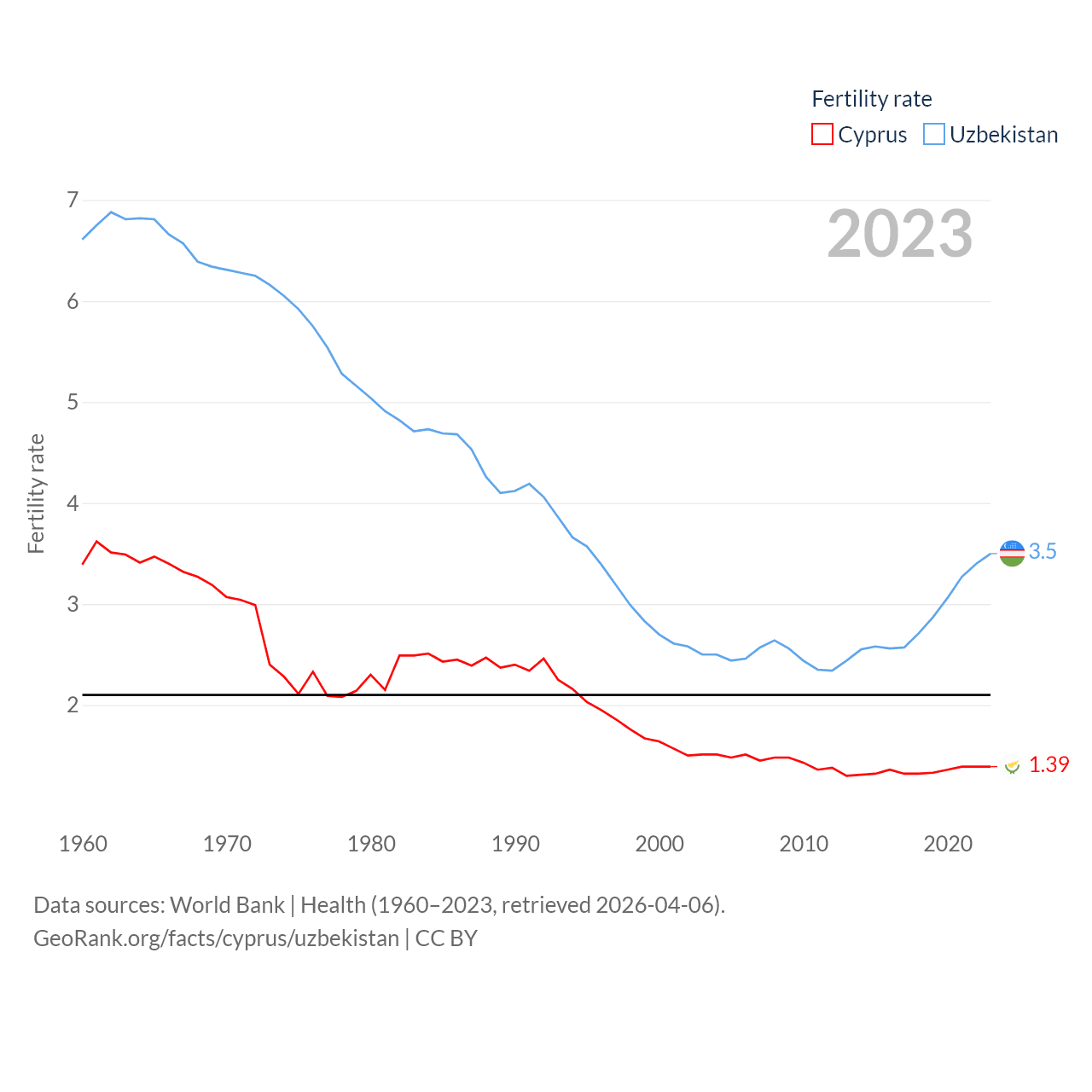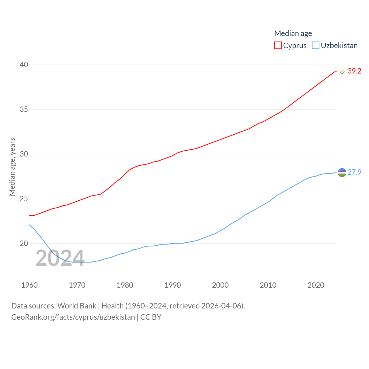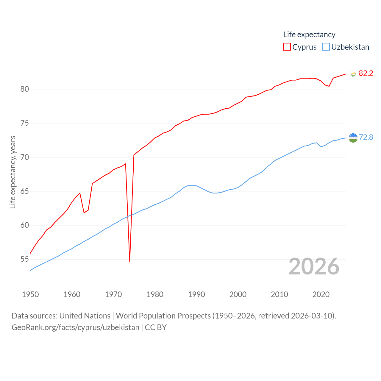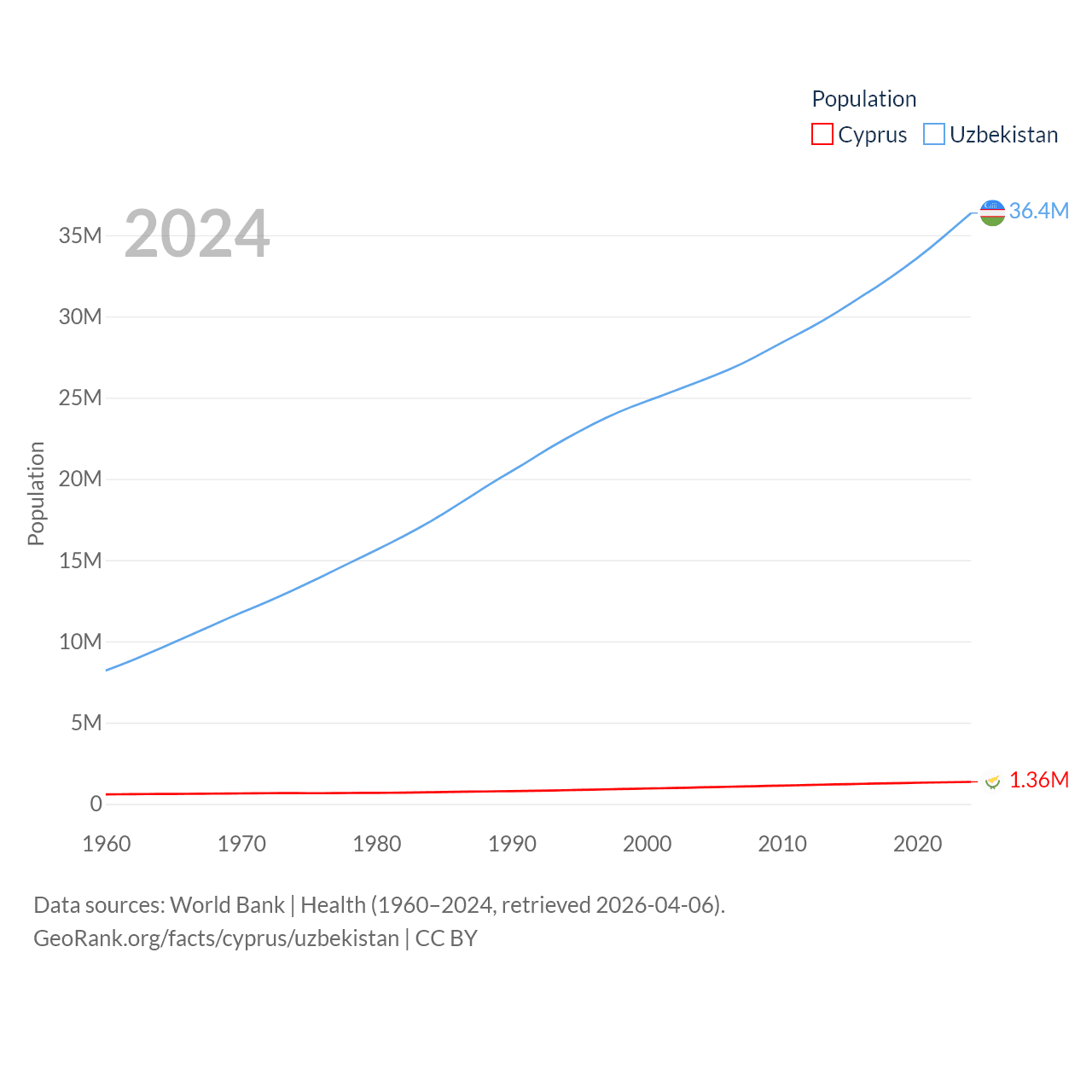 Cyprus has a population of 1.36M (ranked 155/197), compared with 36.4M in Uzbekistan (ranked 43/197). Cyprus' land area is 3,568 sq mi versus 170,136 sq mi for Uzbekistan (ranked 163rd vs. 56th).
