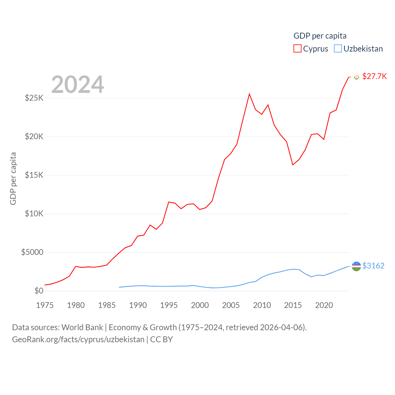 By GDP, Cyprus ranks 103/197 ($37.6B) and Uzbekistan ranks 66/197 ($115B). By GDP per capita, Cyprus ranks 45/197 ($27,707), while Uzbekistan ranks 139/197 ($3,162).