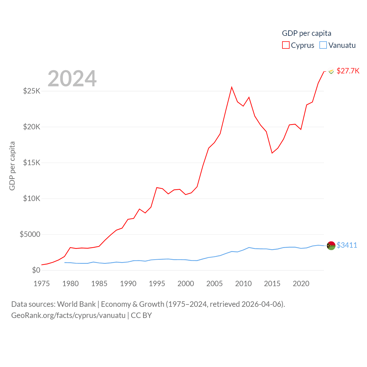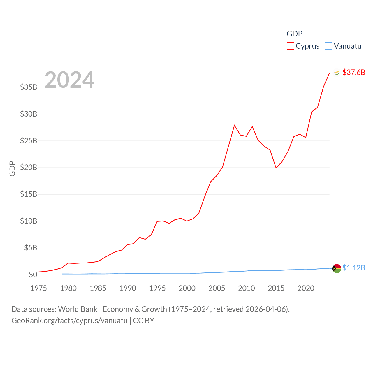 By GDP, Cyprus ranks 103/197 ($37.6B) and Vanuatu ranks 188/197 ($1.12B). By GDP per capita, Cyprus ranks 45/197 ($27,707), while Vanuatu ranks 137/197 ($3,411).