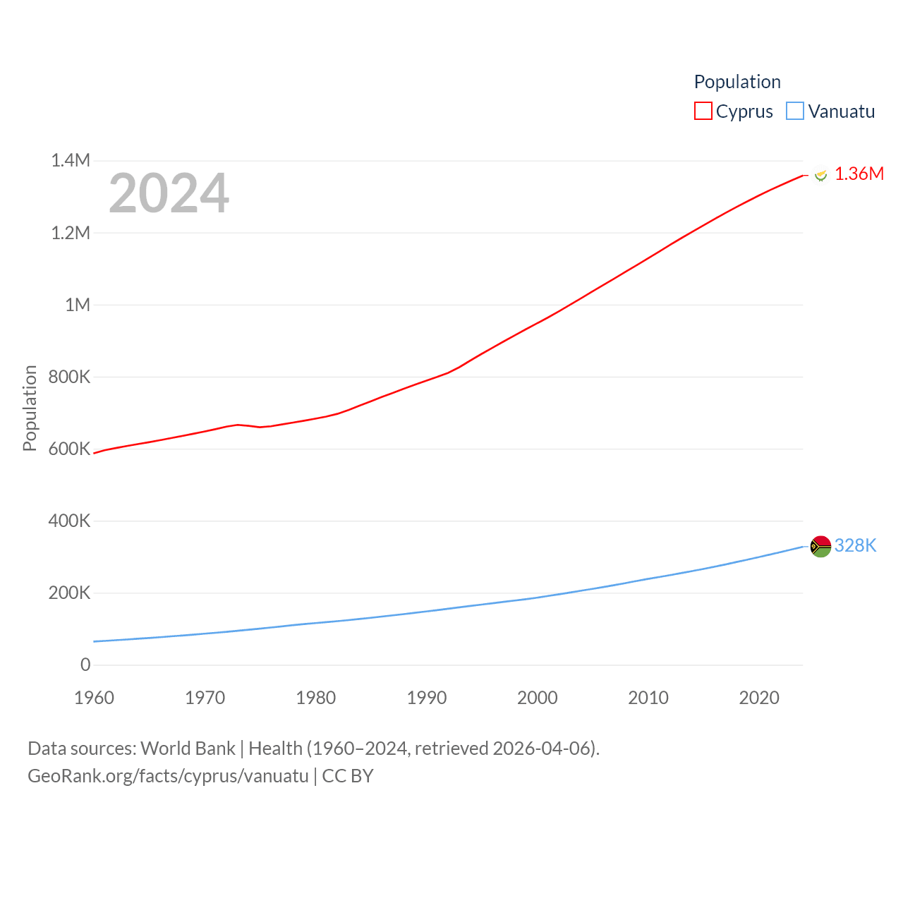 Cyprus has a population of 1.36M (ranked 155/197), compared with 328K in Vanuatu (ranked 174/197). Cyprus' land area is 3,568 sq mi versus 4,707 sq mi for Vanuatu (ranked 163rd vs. 157th).