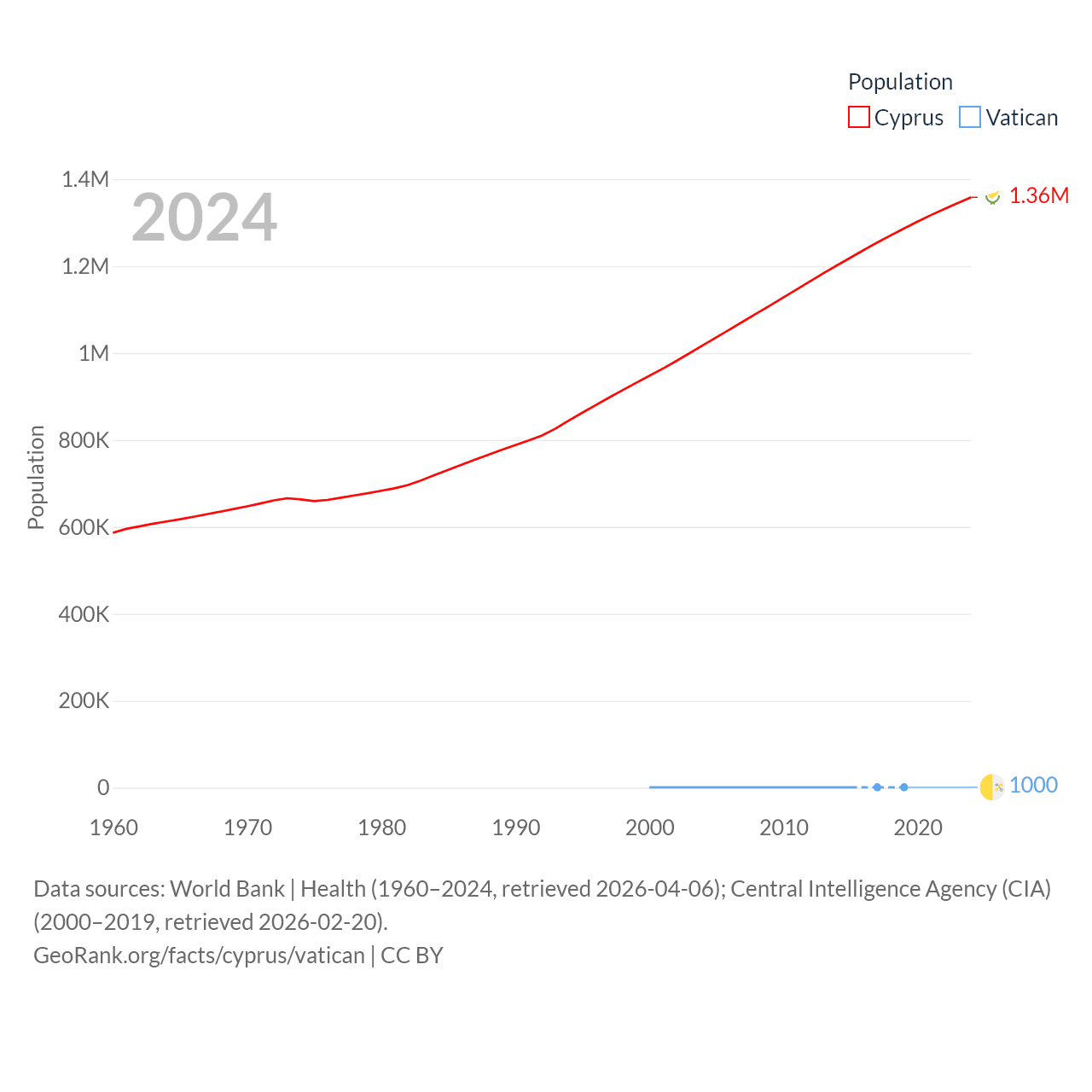 Cyprus has a population of 1.36M (ranked 155/197), compared with 1K in The Vatican (ranked 197/197). Cyprus' land area is 3,568 sq mi versus 0.17 sq mi for The Vatican (ranked 163rd vs. 197th).