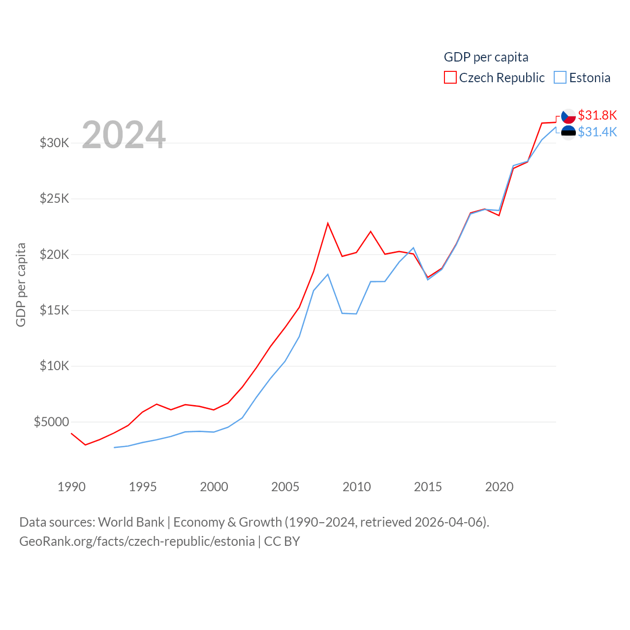 By GDP, The Czech Republic ranks 44/197 ($347B) and Estonia ranks 100/197 ($43.1B). By GDP per capita, The Czech Republic ranks 39/197 ($31,823), while Estonia ranks 40/197 ($31,428).
