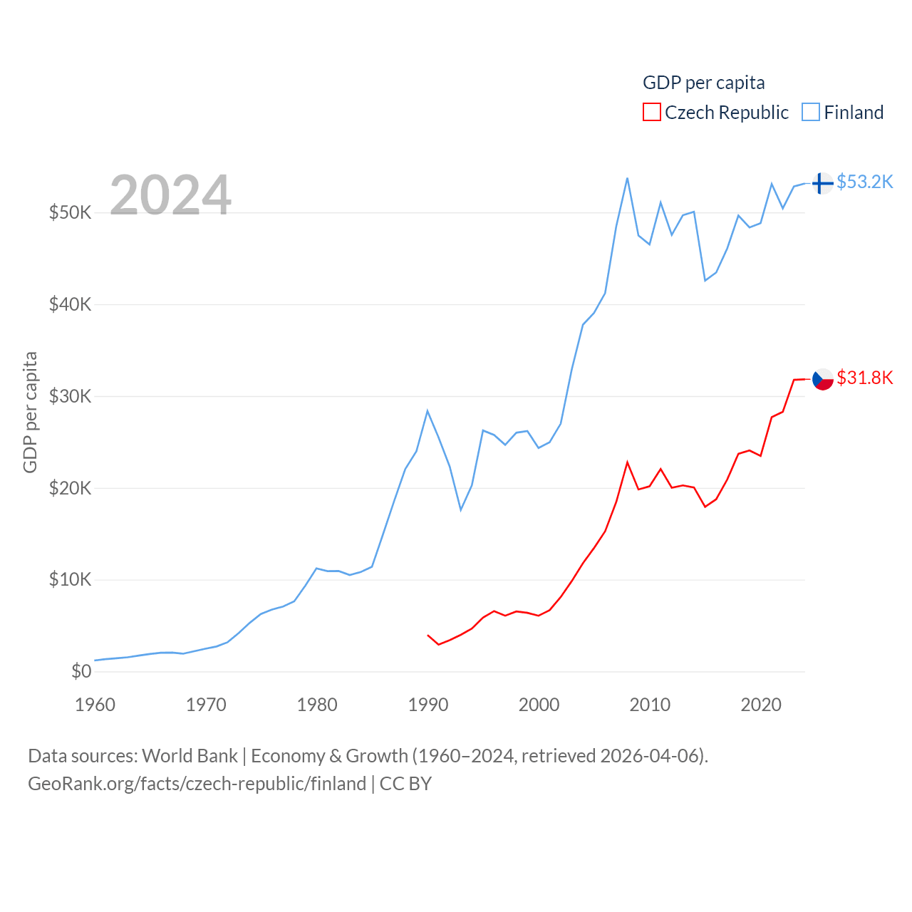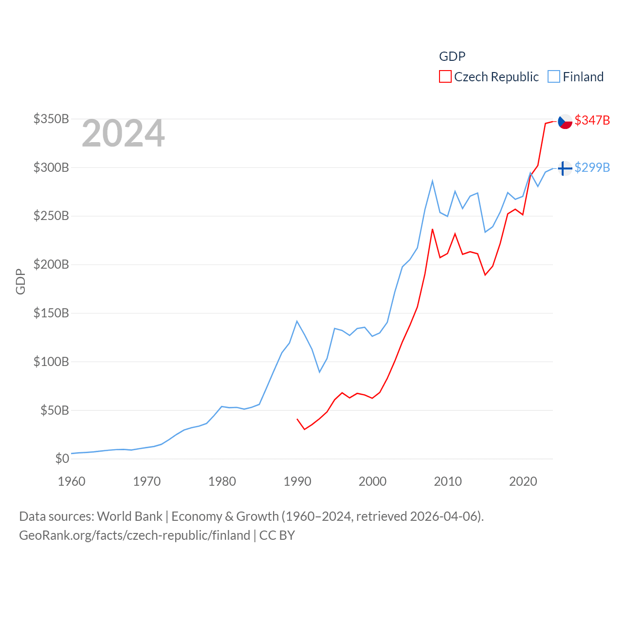 By GDP, The Czech Republic ranks 44/197 ($347B) and Finland ranks 47/197 ($299B). By GDP per capita, The Czech Republic ranks 39/197 ($31,823), while Finland ranks 23/197 ($53,150).