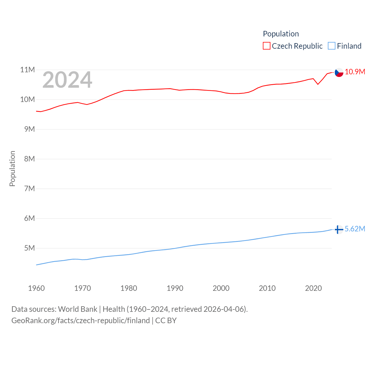 The Czech Republic has a population of 10.9M (ranked 88/197), compared with 5.62M in Finland (ranked 116/197). The Czech Republic's land area is 29,794 sq mi versus 117,360 sq mi for Finland (ranked 114th vs. 70th).