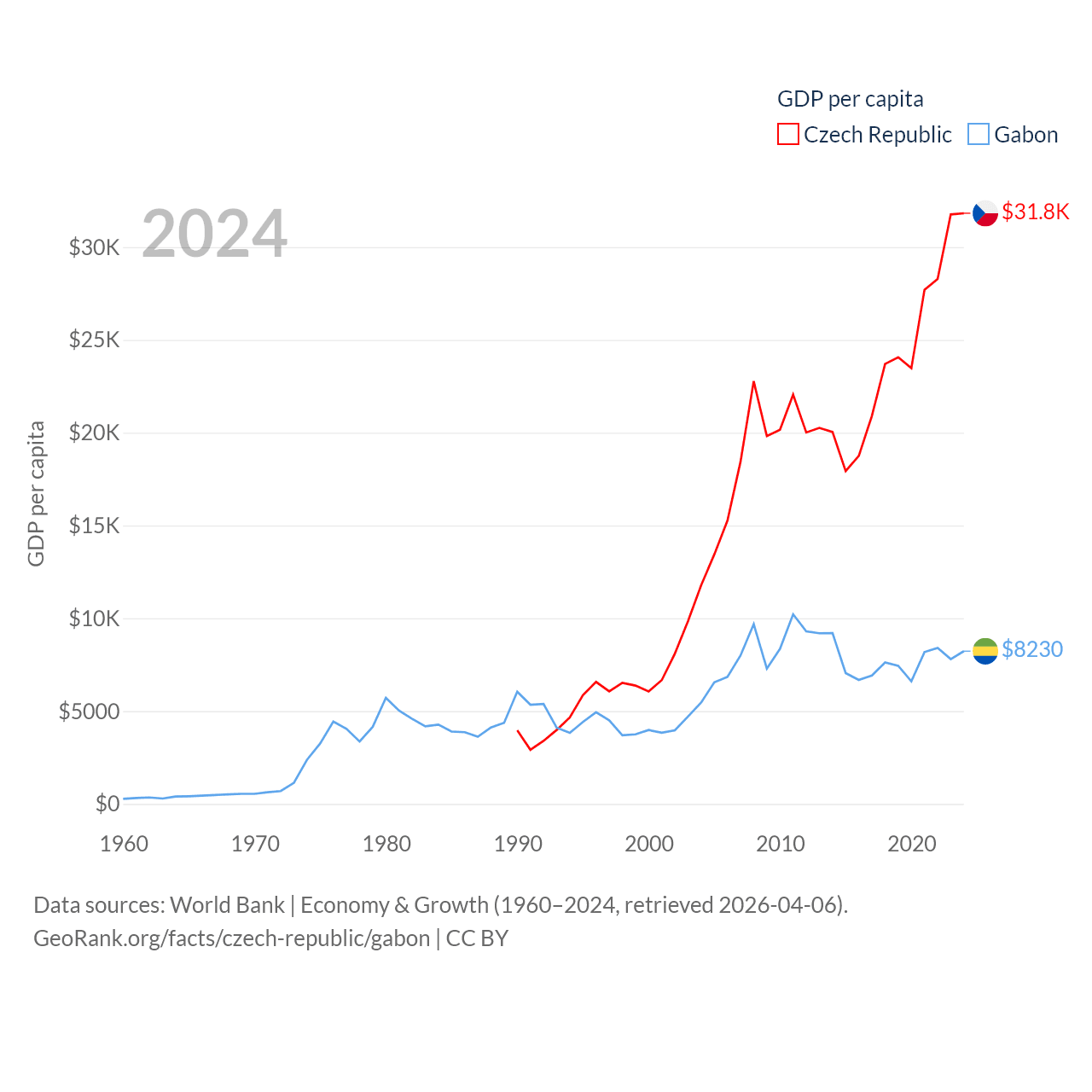 By GDP, The Czech Republic ranks 44/197 ($347B) and Gabon ranks 127/197 ($20.9B). By GDP per capita, The Czech Republic ranks 39/197 ($31,823), while Gabon ranks 93/197 ($8,230).