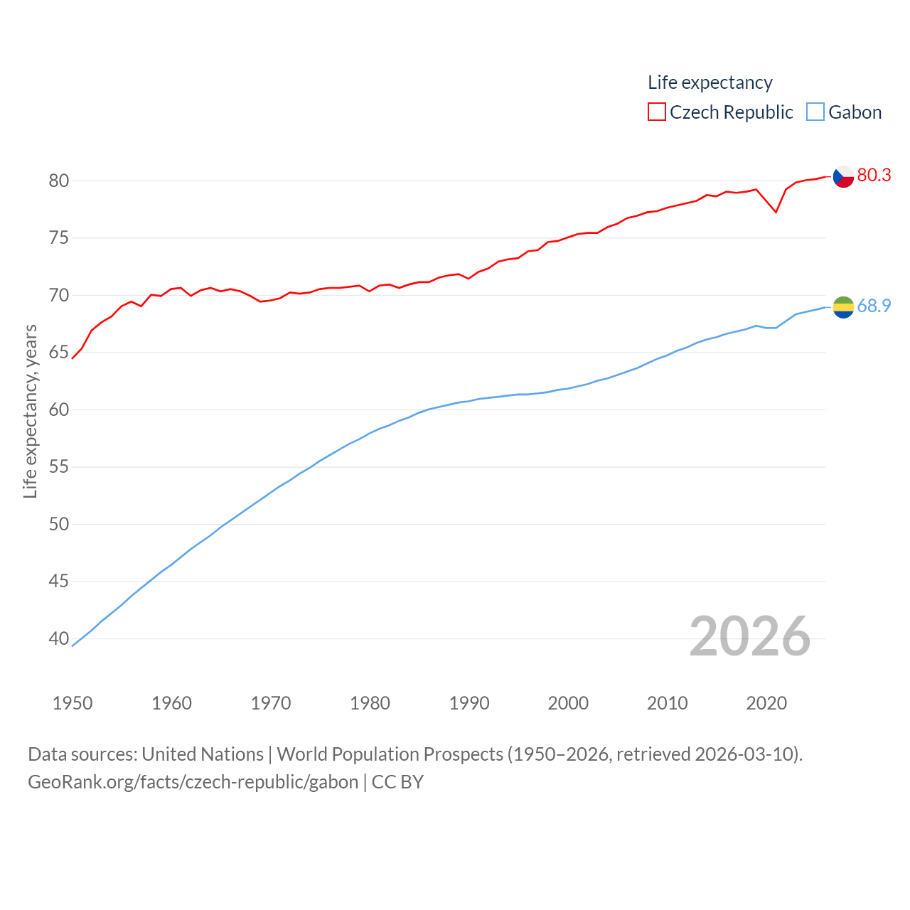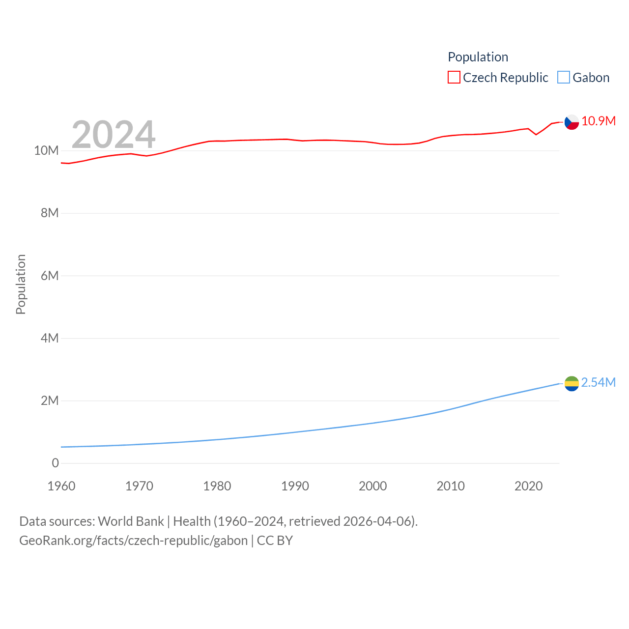 The Czech Republic has a population of 10.9M (ranked 88/197), compared with 2.54M in Gabon (ranked 141/197). The Czech Republic's land area is 29,794 sq mi versus 99,487 sq mi for Gabon (ranked 114th vs. 75th).