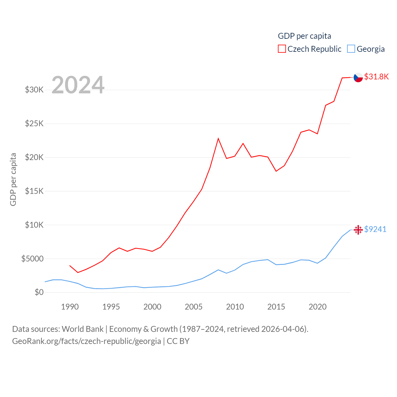 By GDP, The Czech Republic ranks 44/197 ($347B) and Georgia ranks 107/197 ($34.2B). By GDP per capita, The Czech Republic ranks 39/197 ($31,823), while Georgia ranks 89/197 ($9,241).