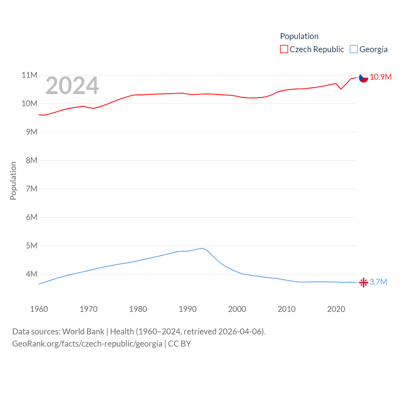 The Czech Republic has a population of 10.9M (ranked 88/197), compared with 3.7M in Georgia (ranked 130/197). The Czech Republic's land area is 29,794 sq mi versus 26,830 sq mi for Georgia (ranked 114th vs. 118th).